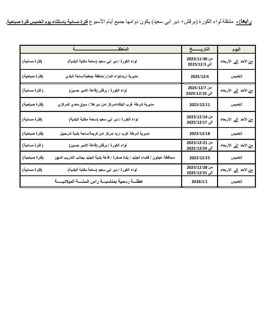 حيث ستكون ساعات الدوام الصباحي من يوم الأحد ولغاية يوم الأربعاء من الساعة 8:00 صباحًا وحتى الساعة 2:00 ظهرًا، ويوم الخميس من الساعة 8:00 صباحًا ولغاية الساعة 1:00 ظهرًا ودوام المحطات المسائية من الساعة 3:00 عصراً حتى الساعة 8:00 مساءً.