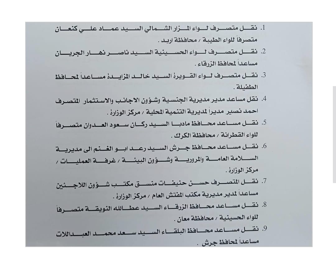 9. نقل مساعد محافظ البلقاء سعد محمد العبداللات مساعداً لمحافظ جرش.