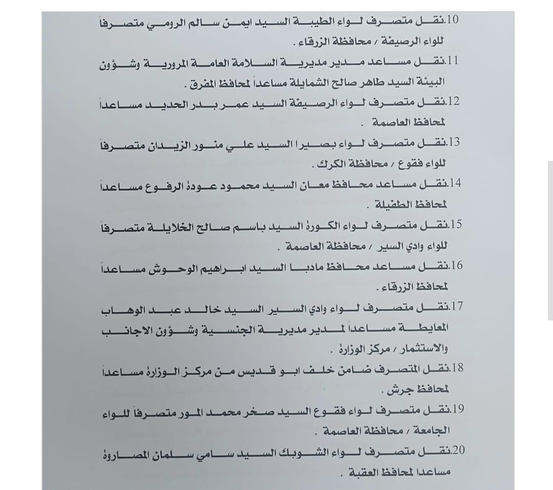 16. نقل مساعد محافظ مادبا ابراهيم الوحوش مساعداً لمحافظ الزرقاء.