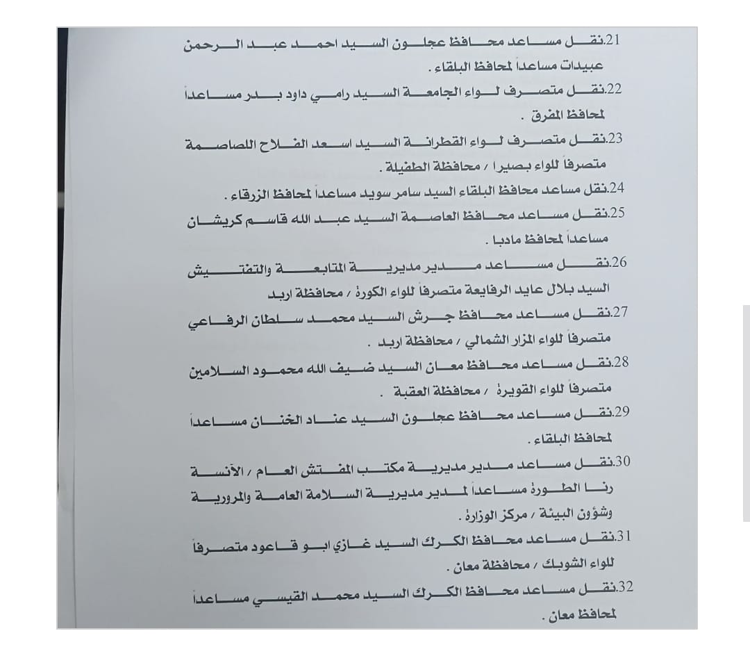 29. نقل مساعد محافظ عجلون عناد الخنان مساعداً لمحافظ البلقاء.