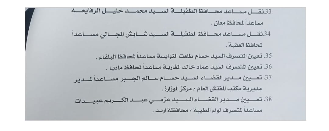 33. نقل مساعد محافظ الطفيلة محمد خليل الرفايعة مساعداً لمحافظ معان.