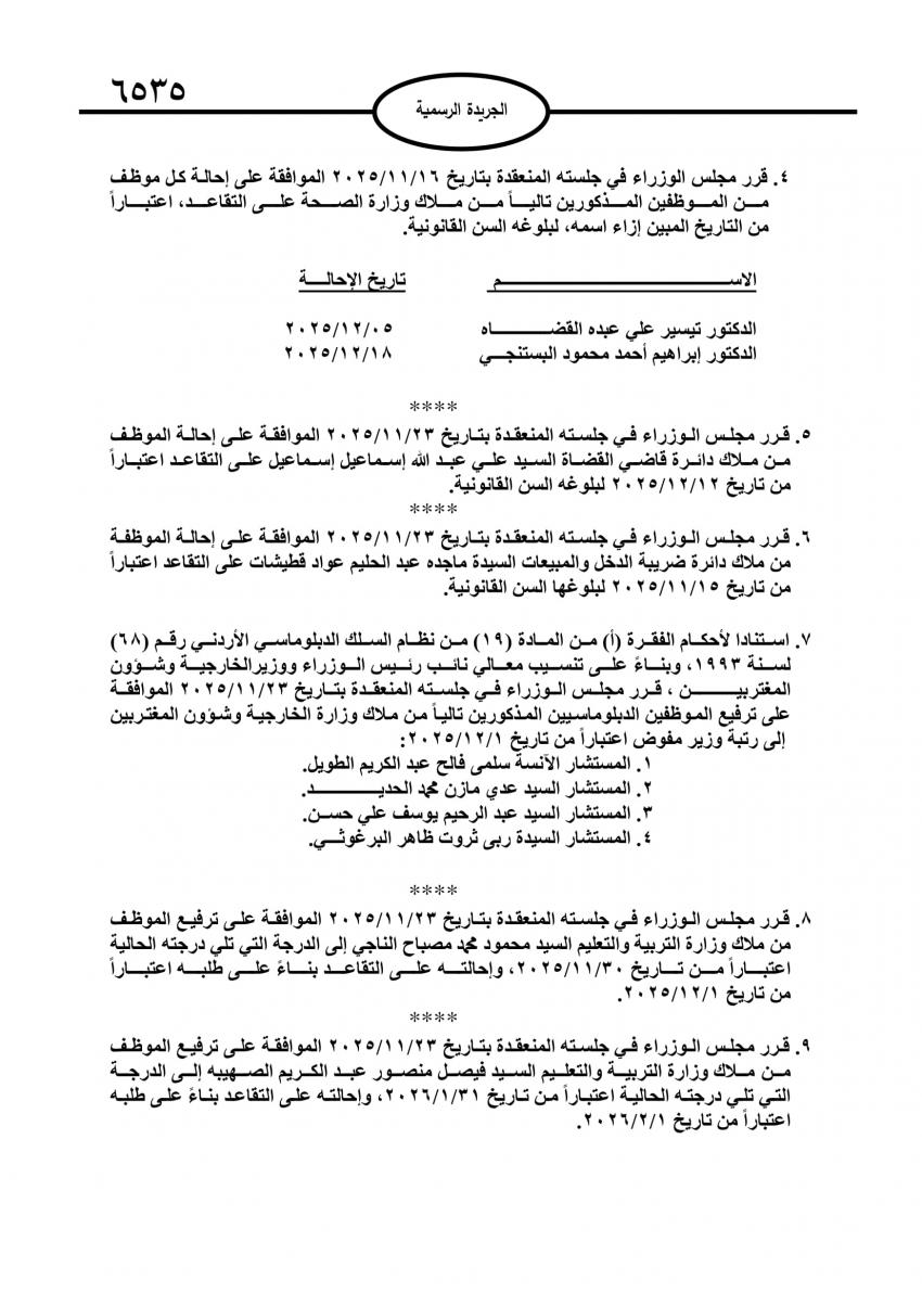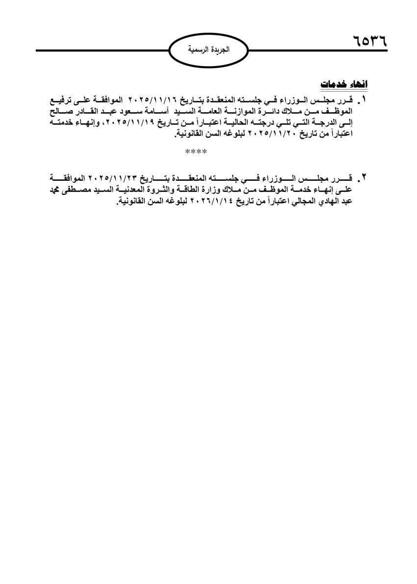 صدر في عدد الجريدة الرسمية اليوم الاثنين، قرارات مجلس الوزراء بالموافقة على إحالة موظفين حكوميين إلى التقاعد، وانهاء خدمات آخرين.