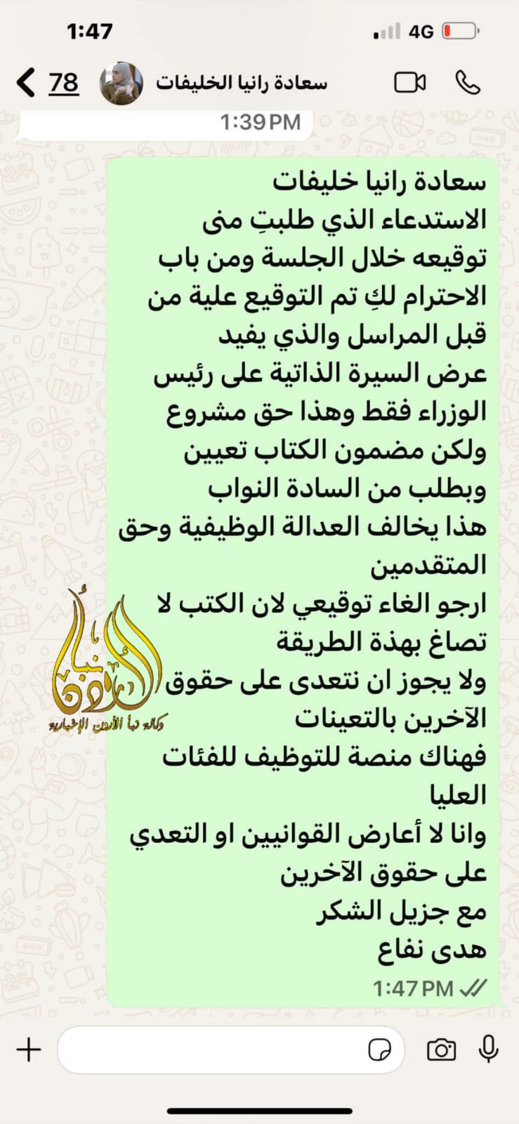 كما نشرت نفاع رسالة "واتس أب"، ارسلتها لزميلتها النائب رانيا خليفات تطلب فيها سحب توقيعها.