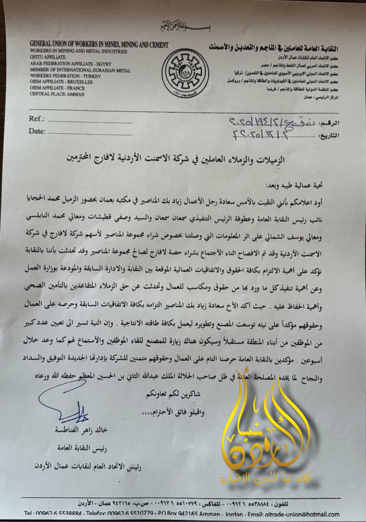 كشف خالد زاهر الفناطسة، رئيس النقابة العامة للعاملين في المناجم والتعدين والإسمنت، ورئيس الاتحاد العام لنقابات عمال الأردن عن تفاصيل الاجتماع الذي عُقد مع رجل الأعمال زياد المناصير، وذلك عقب إعلان مجموعة المناصير استحواذها على شركة ومصنع لافارج للإسمنت.