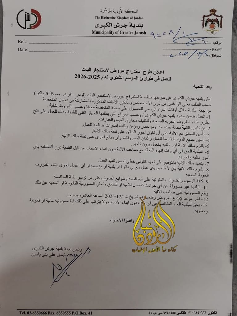 بلدية جرش الكبرى تعلن عن طلب استئجار جرافات و جريدرات و باكو للعمل في طوارئ الشتاء (وثيقة)
