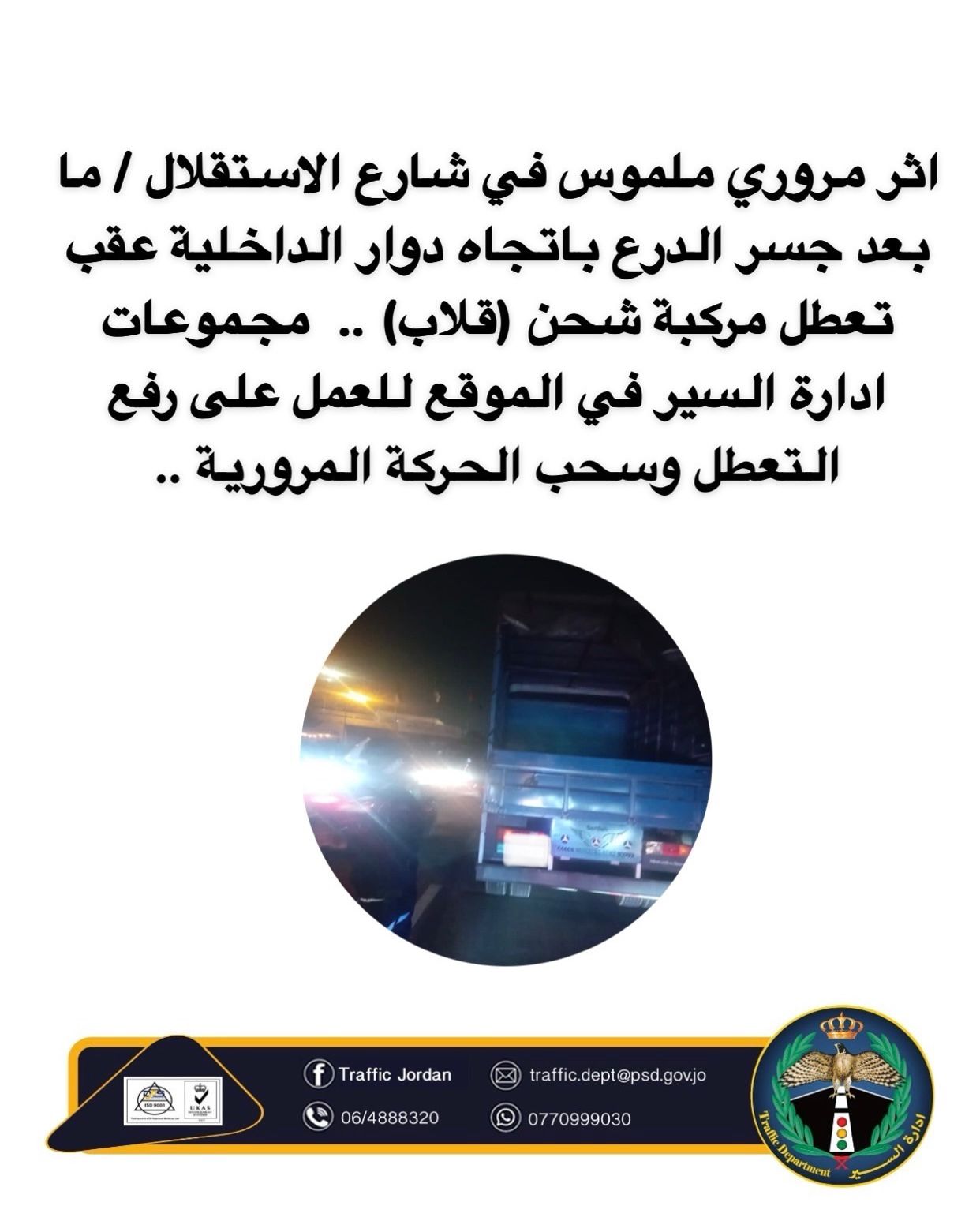 قالت إدارة السير إن سبب تباطؤ السير في شارع الاستقلال، ما بعد جسر الدرع باتجاه دوار الداخلية يعود إلى تعطل مركبة شحن (قلاب) .