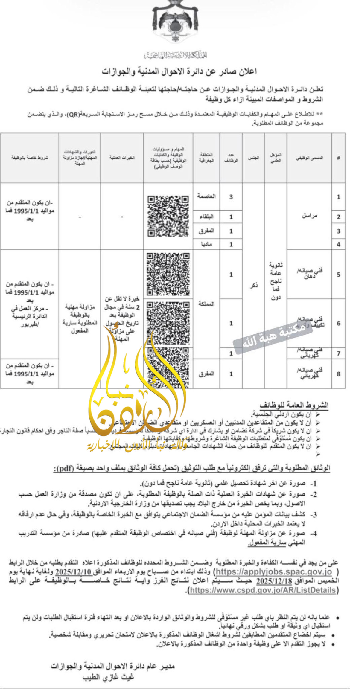 أعلنت دائرة الأحوال المدنية عن فتح باب التقديم للوظائف بدءًا من صباح يوم الأربعاء، الموافق 10/12/2025، داعية الراغبين في التقديم إلى متابعة التفاصيل والإجراءات الرسمية الخاصة بالوظائف المتاحة