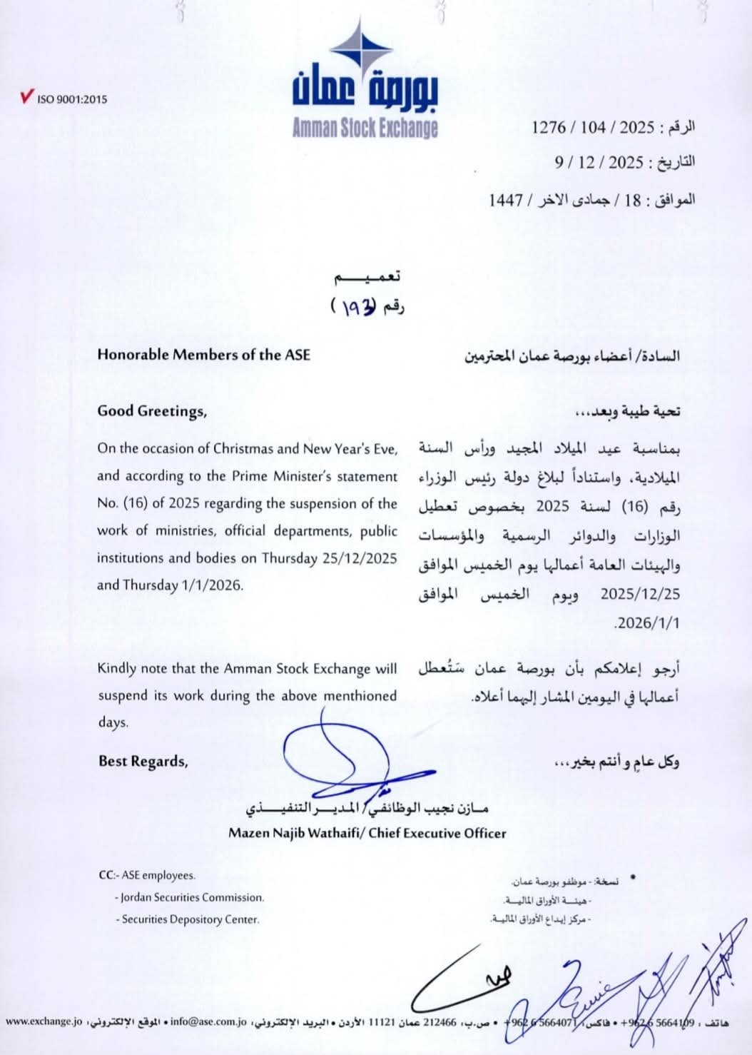 عممت بورصة عمان بتعطيل أعمالها بمناسبة عيد الميلاد المجيد ورأس السنة الميلادية.