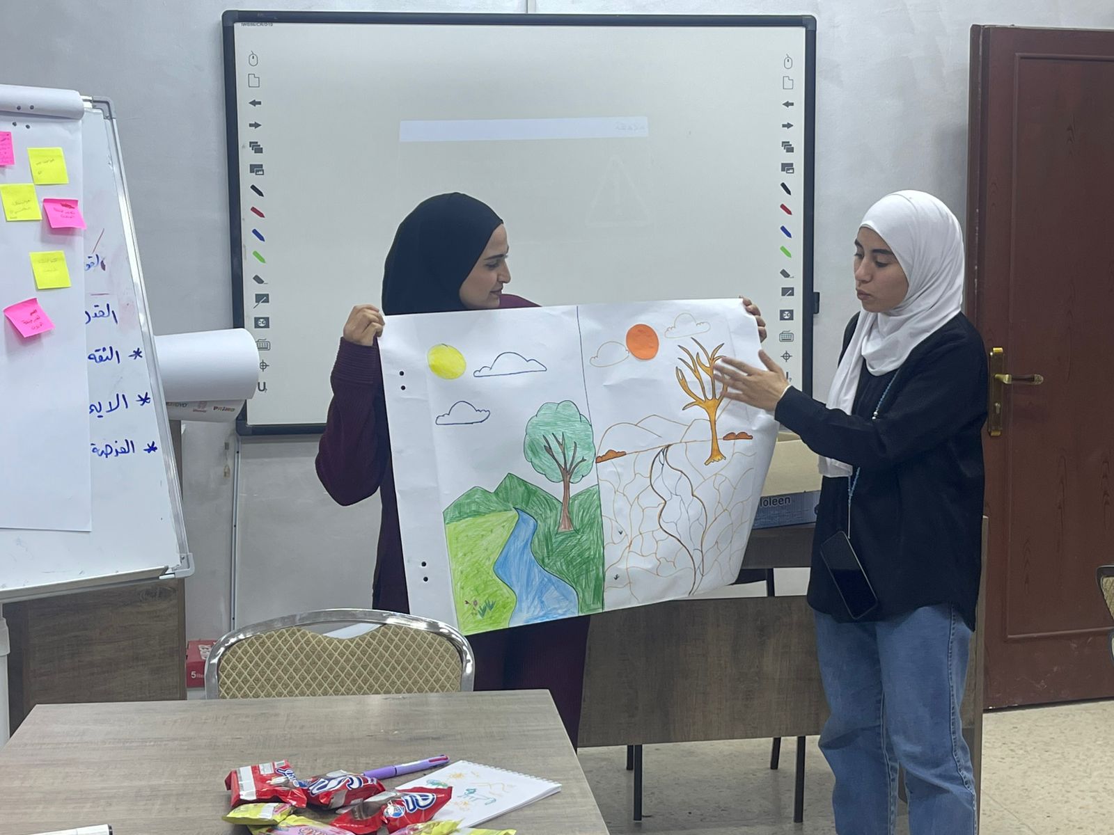ويتضمن البرنامج التدريبي الذي يستمر على مدار 3 أيام، تعريف المشاركين بمفهوم المناخ والطقس والتغير المناخي، وآثاره على الأفراد والمجتمع والنظام البيئي، والمفاهيم المرتبطة بالتغير المناخي كالاحتباس الحراري والعدالة المناخية وإعادة التدوير والمواطنة البيئية، والمناخ والنوع الاجتماعي، إضافة إلى التعريف بالسلوكيات السلبية التي تسهم في تغير المناخ، وتطوير سلوكيات إيجابية فردية للتقليل من آثار التغير المناخي، وإطلاق مبادرات في نهاية البرنامج تتضمن حملات توعوية لترشيد استهلاك المياه، وتنظيف المناطق المحيطة، وزراعة الأشجار، وتنفيذ مبادرات للتوعية المجتمعية من خلال الرسم .