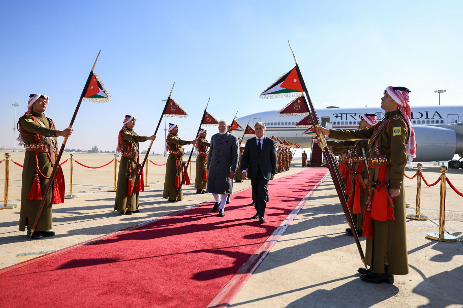 وجرت للضَّيف مراسم استقبال رسميَّة لدى وصوله مطار الملكة علياء الدَّولي، حيث اصطفّ حرس الشرف لتحيَّته، وعزفت الموسيقى السَّلامين الجمهوري الهندي والملكي الأردني.