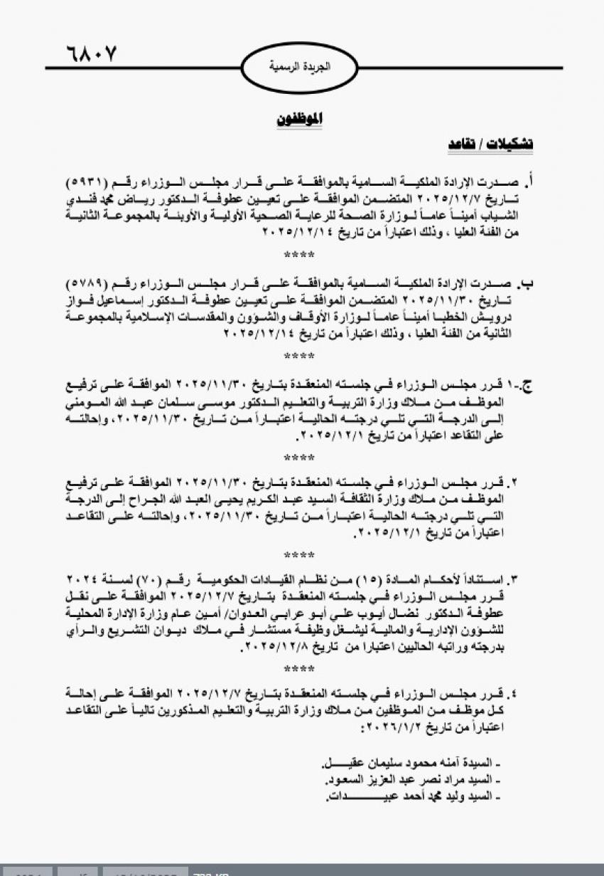 صدرت الإرادة الملكية السامية، في عدد الجريدة الرسمية اليوم الثلاثاء، الموافقة على قرار مجلس الوزراء المتضمن بتعيين وترفيع وإحالة موظفين حكوميين إلى التقاعد .