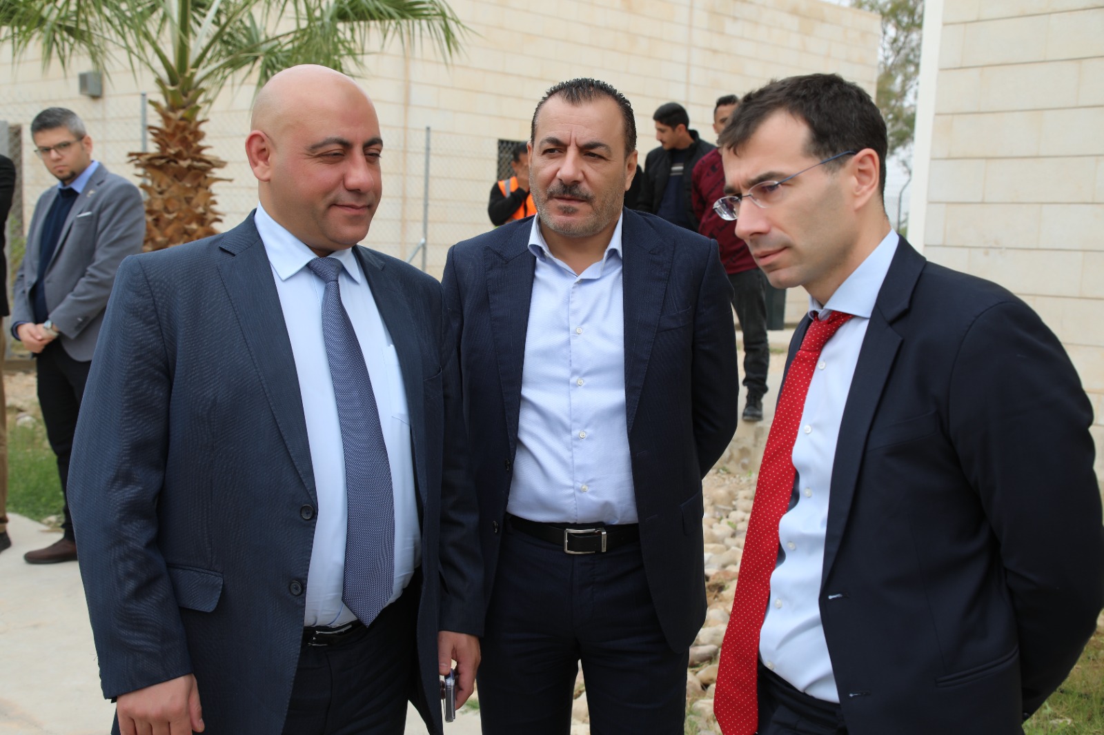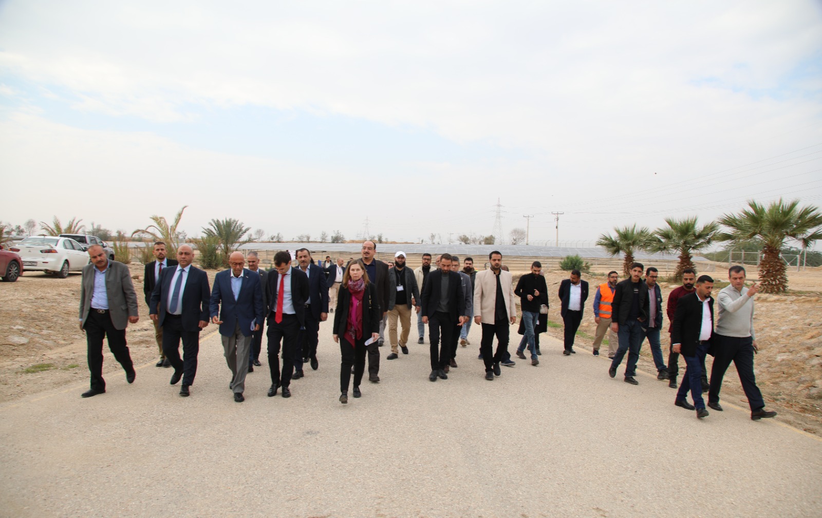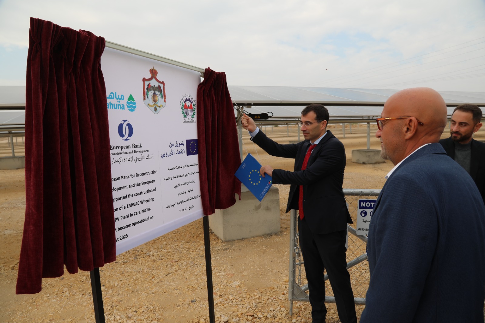 The Minister of Water and Irrigation, Eng. Raed Abu Al-Soud, inaugurated the operation of the photovoltaic solar energy project at the Zara–Ma’in Station, in the presence of the European Union Ambassador Pierre-Christophe Chatzisavas, the Secretary General of the Water Authority Eng. Sufyan Al-Battayneh, the CEO of Miyahuna Company Eng. Mohammad Al-owran, and representatives of the European Bank for Reconstruction and Development (EBRD).