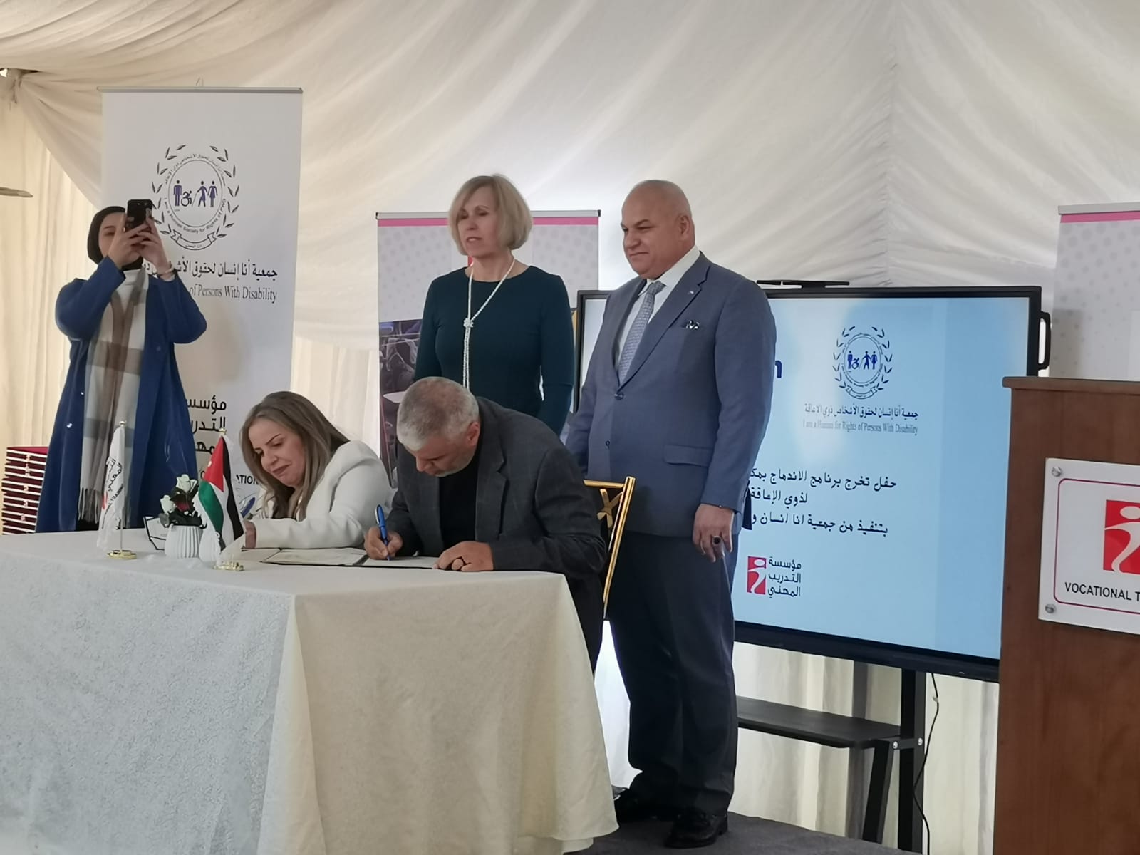 وشهد الحفل حضور مدير مديرية عمل وتشغيل الزرقاء أشرف مطر ، ومدير مؤسسة التدريب المهني رأفت الصوافين، وعدد من مدراء مؤسسة التدريب المهني في الرصيفة، إلى جانب نخبة من ممثلي ووجهاء المجتمع المدني، الذين أكدوا أهمية هذه المبادرات في دعم وتمكين الأشخاص ذوي الإعاقة ودمجهم في سوق العمل والمجتمع .