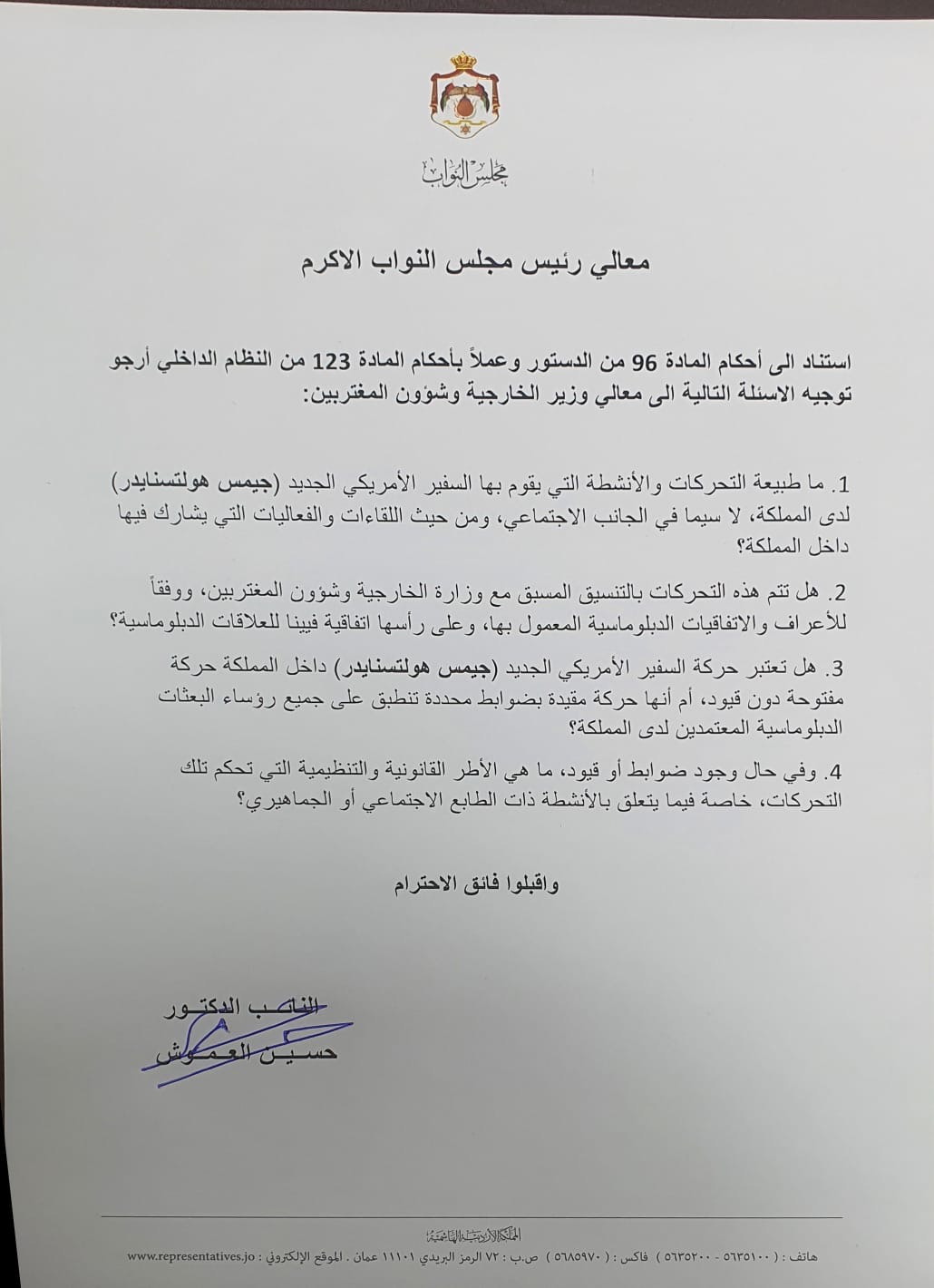 وجّه النائب الدكتور حسين العموش سؤالاً نيابياً إلى معالي وزير الخارجية وشؤون المغتربين، عبر معالي رئيس مجلس النواب، استناداً إلى أحكام المادة (96) من الدستور وعملاً بأحكام المادة (123) من النظام الداخلي لمجلس النواب، حول طبيعة تحركات وأنشطة السفير الأمريكي الجديد لدى المملكة، جيمس هولتسنايدر.
