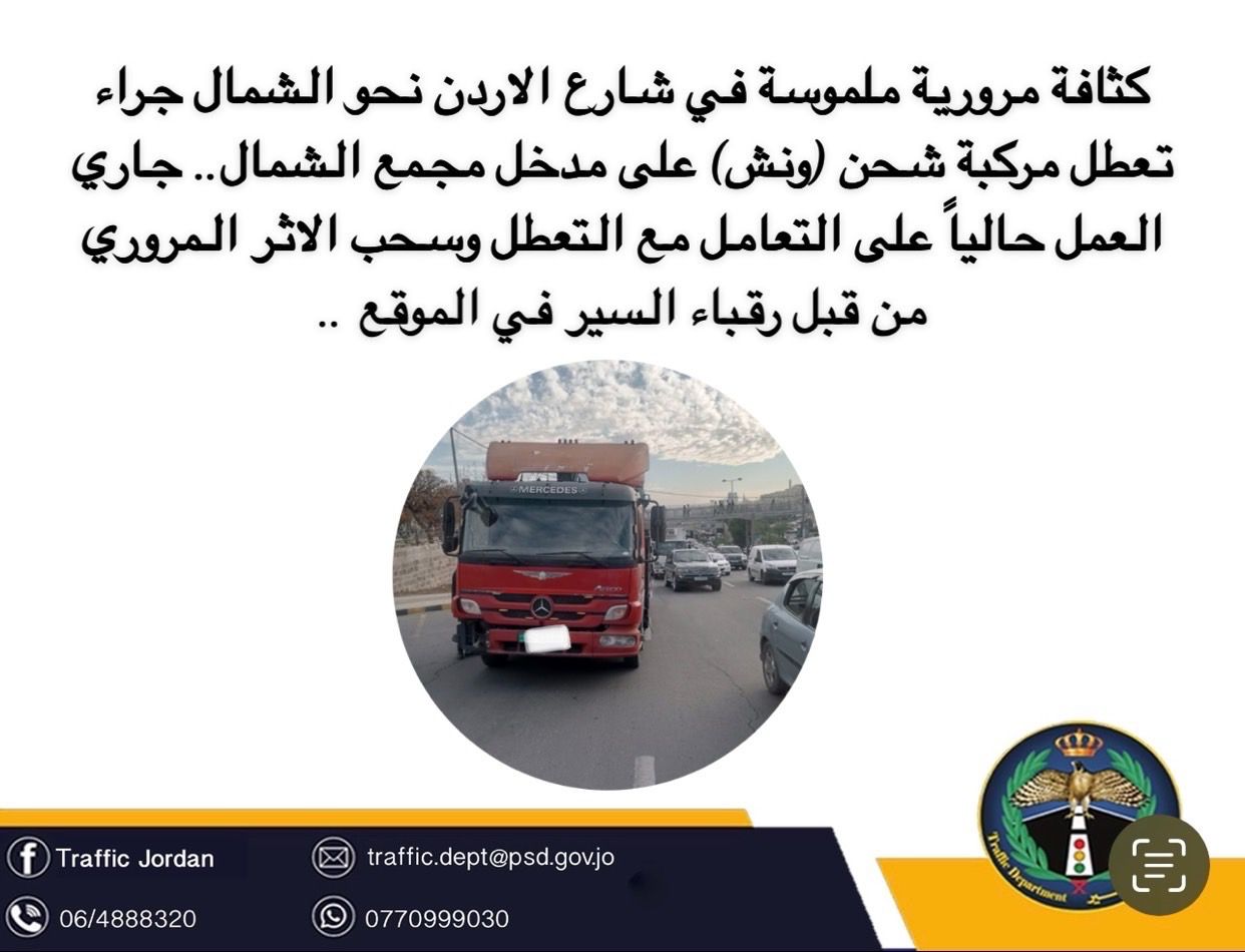 سُجلت كثافة مرورية ملموسة في شارع الأردن باتجاه الشمال، نتيجة تعطل مركبة شحن (ونش) على مدخل مجمع الشمال. وتعمل كوادر رقباء السير المتواجدون في الموقع حاليًا على التعامل مع التعطل وسحب الأثر المروري