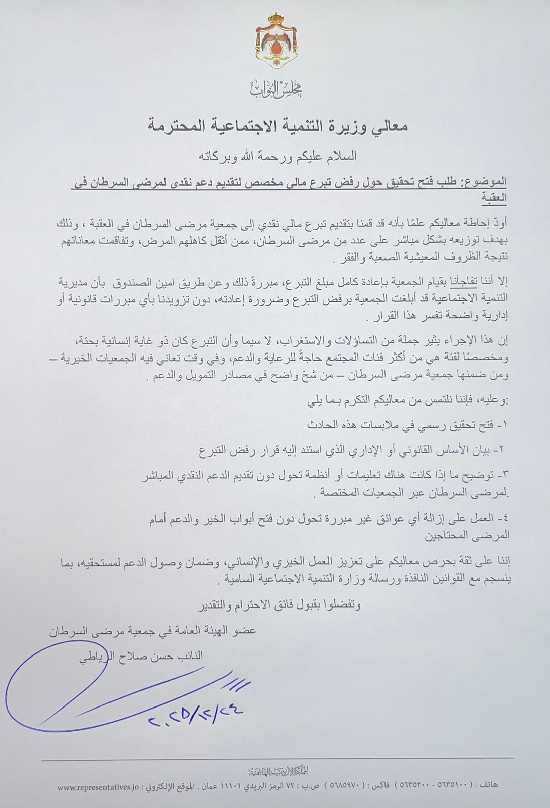 احمد قدورة - طالب النائب حسن الرياطي بفتح تحقيق رسمي حول رفض تبرع مالي نقدي كان مخصصًا لدعم مرضى السرطان في محافظة العقبة، وذلك في كتاب رسمي وجّهه إلى معالي وزيرة التنمية الاجتماعية.