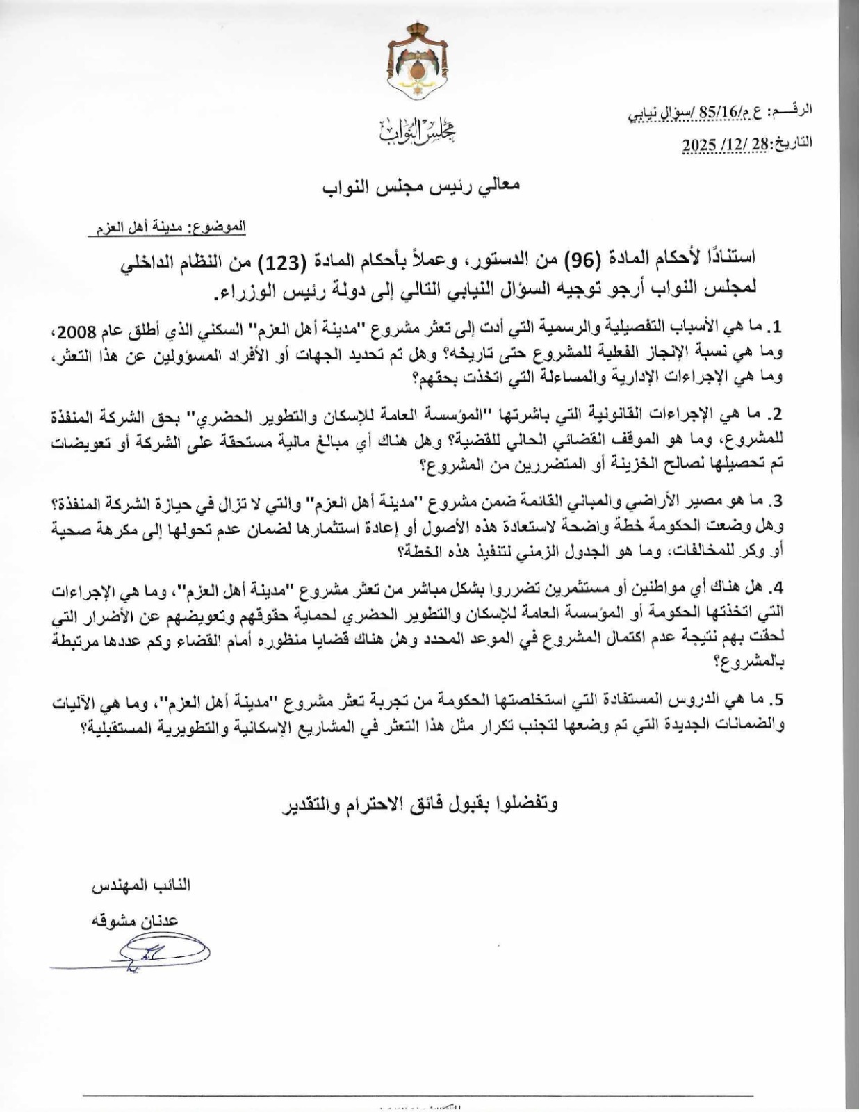 1. ما هي الأسباب التفصيلية والرسمية التي أدت إلى تعثر مشروع "مدينة أهل العزم" السكني الذي أطلق عام 2008، وما هي نسبة الإنجاز الفعلية للمشروع حتى تاريخه؟ وهل تم تحديد الجهات أو الأفراد المسؤولين عن هذا التعثر، وما هي الإجراءات الإدارية والمساءلة التي اتخذت بحقهم؟