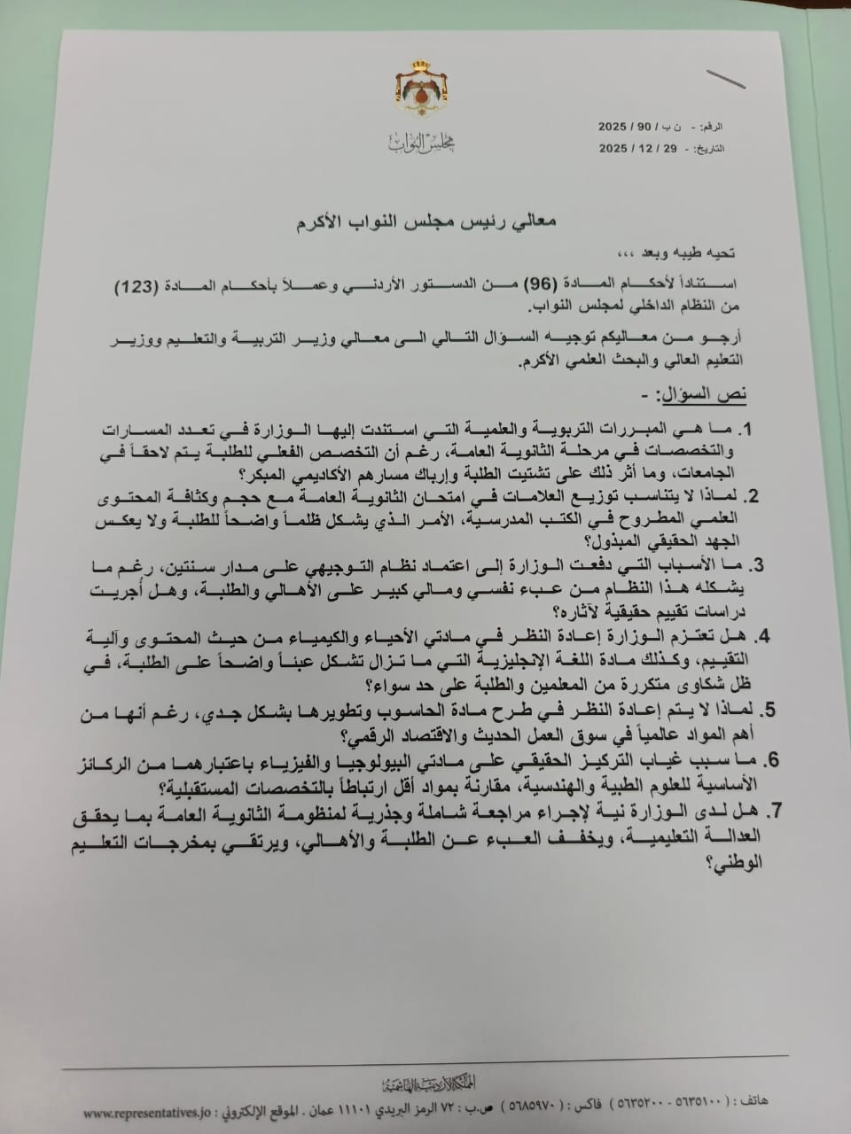 وختم الروابدة سؤاله بالاستفسار عن وجود نية حكومية لإجراء مراجعة شاملة وجذرية لمنظومة الثانوية العامة، بما يحقق العدالة التعليمية، ويخفف الأعباء عن الطلبة وأولياء الأمور، ويرتقي بمخرجات التعليم الوطني.