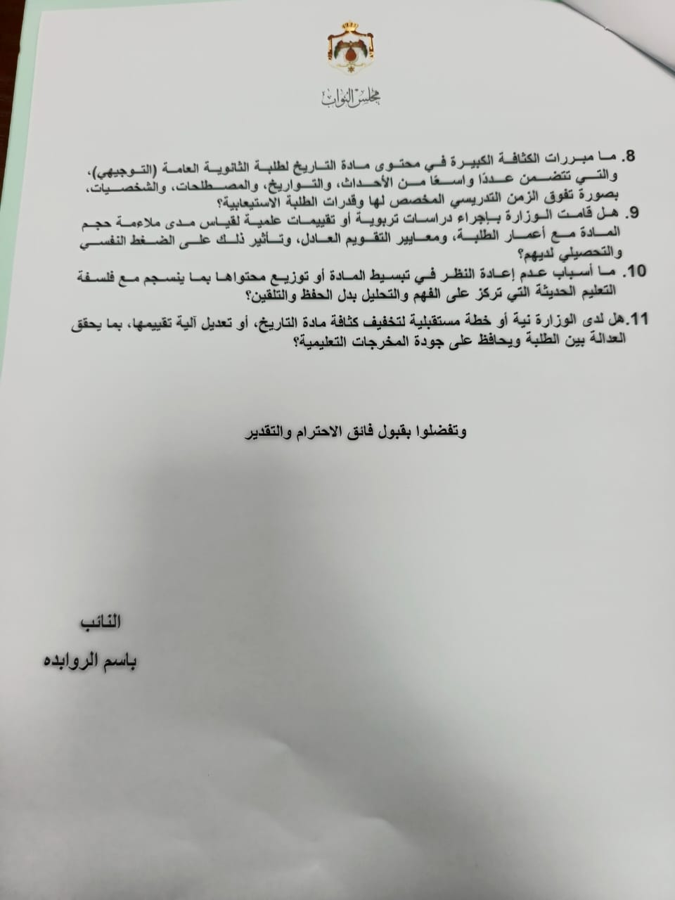 وفي سياق متصل، تساءل النائب عن كثافة محتوى مادة التاريخ لطلبة التوجيهي، ومدى مواءمته للزمن التدريسي وقدرات الطلبة الاستيعابية، وما إذا أُجريت دراسات علمية لقياس ملاءمة المناهج لأعمار الطلبة ومعايير التقييم العادل.