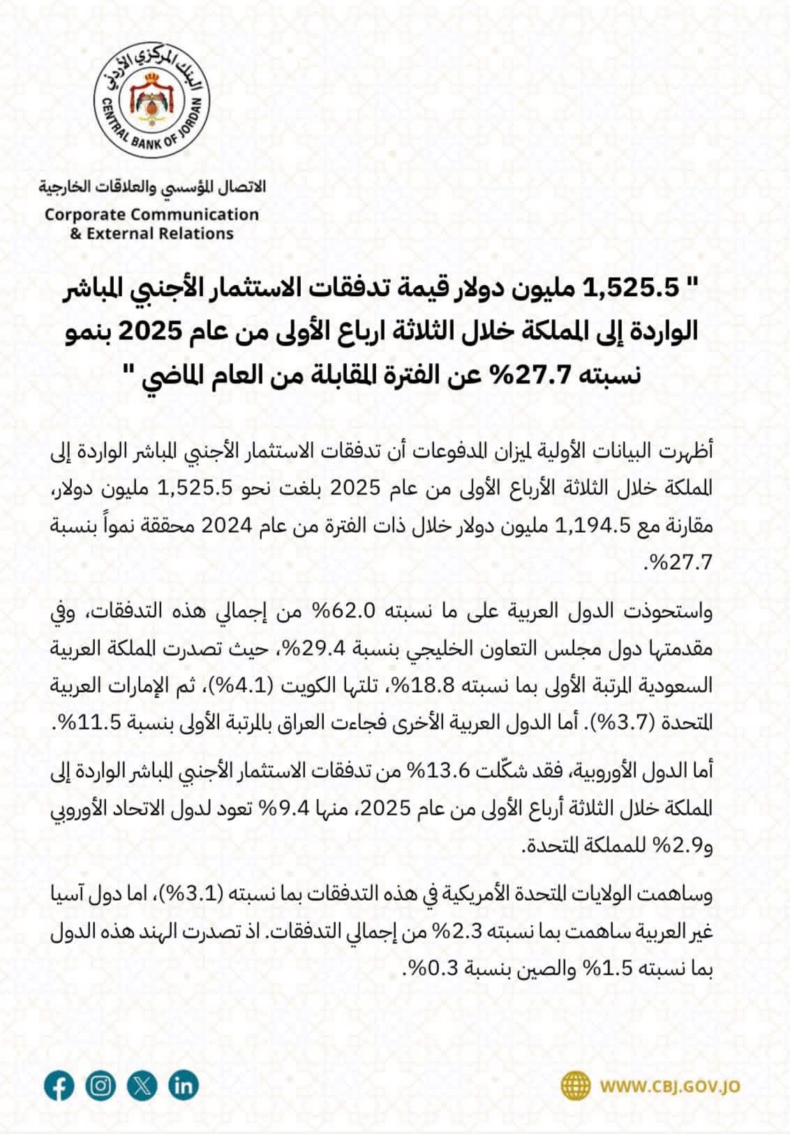 أظهرت البيانات الأولية لميزان المدفوعات أن تدفقات الاستثمار الأجنبي المباشر الواردة إلى المملكة خلال الثلاثة الأرباع الأولى من عام 2025 بلغت نحو 1,525.5 مليون دولار، مقارنة مع 1,194.5 مليون دولار خلال ذات الفترة من عام 2024 محققة نمواً بنسبة 27.7%.