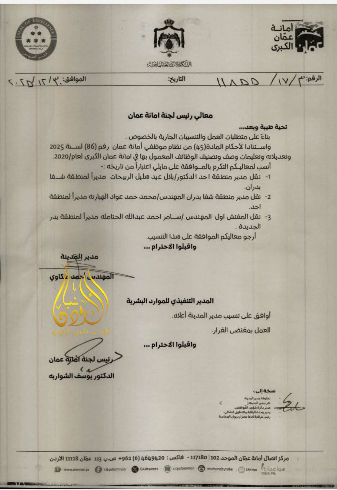 استناداً لأحكام نظام موظفي أمانة عمان وتعليمات وصف وتصنيف الوظائف، وافق المسؤولون على نقل الدكتور بلال عيد هليل الربيحات مديراً لمنطقة شفا بدران، والمهندس محمد حمد عواد الهبارنة مديراً لمنطقة أحد، والمفتش أول المهندس سامر أحمد عبد الله الحتاملة مديراً لمنطقة بدر الجديدة