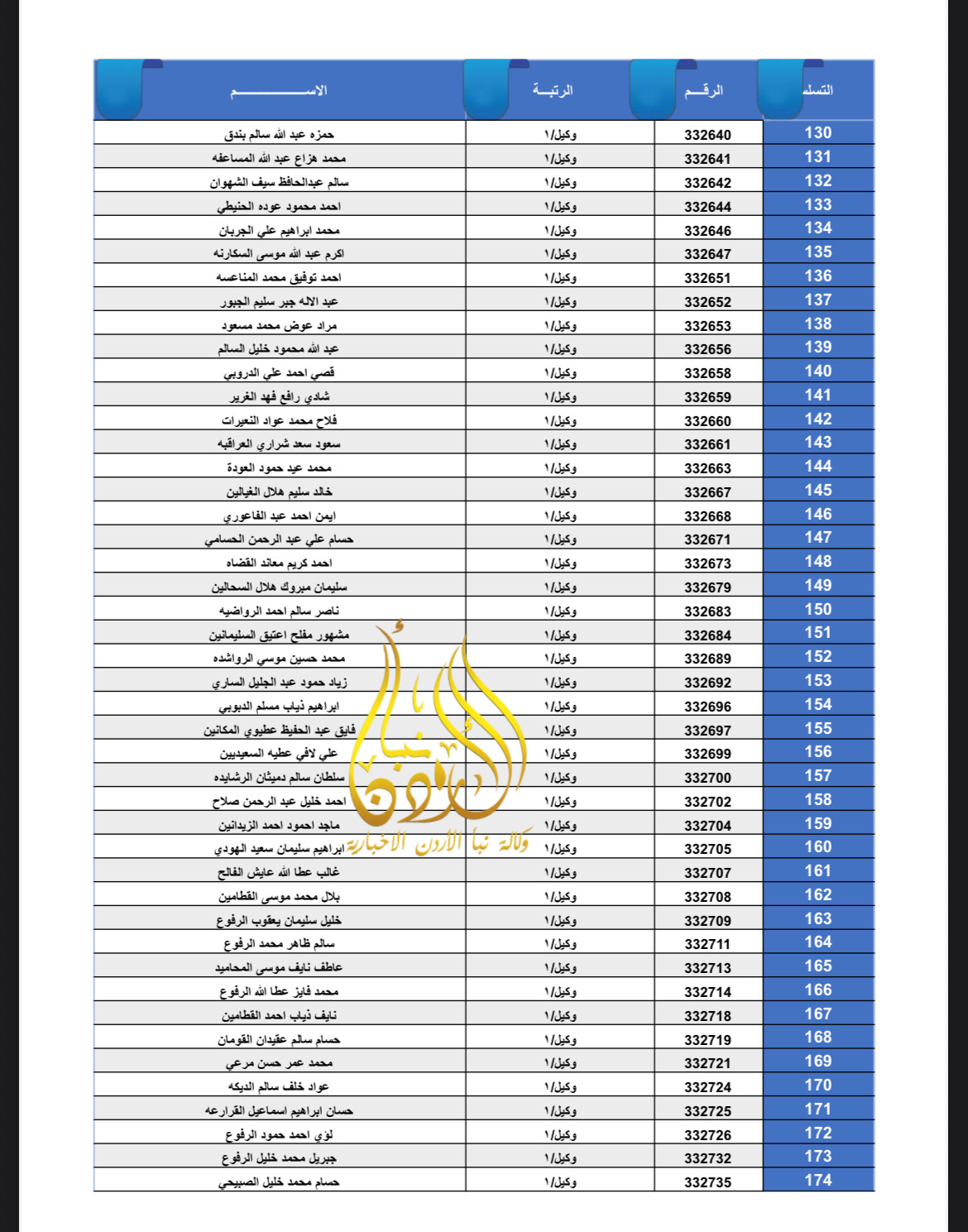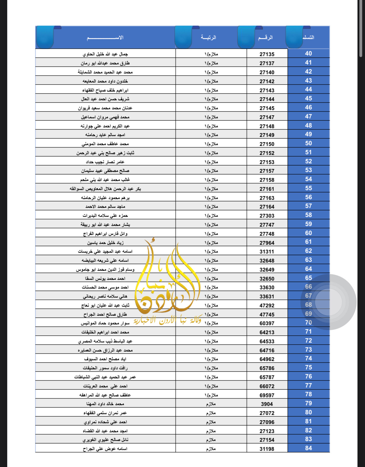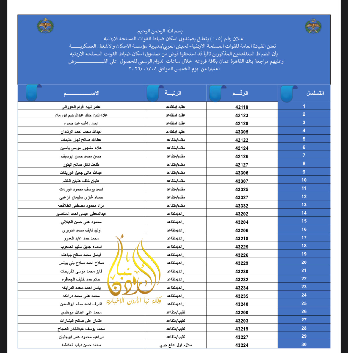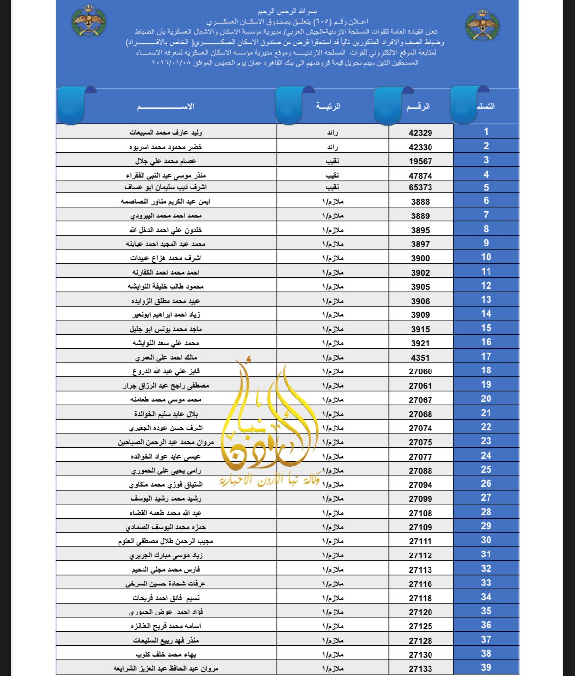 تعلن القيادة العامة للقوات المسلحة الأردنية – الجيش العربي/ مديرية مؤسسة الإسكان والأشغال العسكرية بان الضباط وضباط الصف والأفراد المبينة أسماءهم أدناه قد استحقوا قرض الإسكان العسكري(الخاص بالافراد) والضباط المستفيدين من صندوق إسكان الضباط مراجعة بنك القاهرة عمان بكافة فروعه خلال ساعات الدوام الرسمي اعتباراً من يوم الخميس الموافق 8/01/2026 للحصول على القرض.