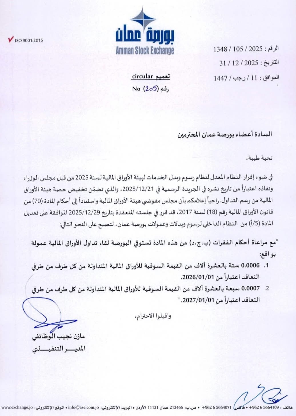 في ضوء إقرار النظام المعدل لنظام رسوم وبدل الخدمات لهيئة الأوراق المالية لسنة 2025 من قبل مجلس الوزراء، ونفاذه اعتباراً من تاريخ نشره في الجريدة الرسمية بتاريخ 2025/12/21، والذي تضمّن تخفيض حصة هيئة الأوراق المالية من رسم التداول، أعلن مجلس مفوضي هيئة الأوراق المالية أنه قرر، استناداً إلى أحكام المادة (70) من قانون الأوراق المالية رقم (18) لسنة 2017، الموافقة على تعديل المادة (5/أ) من النظام الداخلي لرسوم وبدلات وعمولات بورصة عمان.