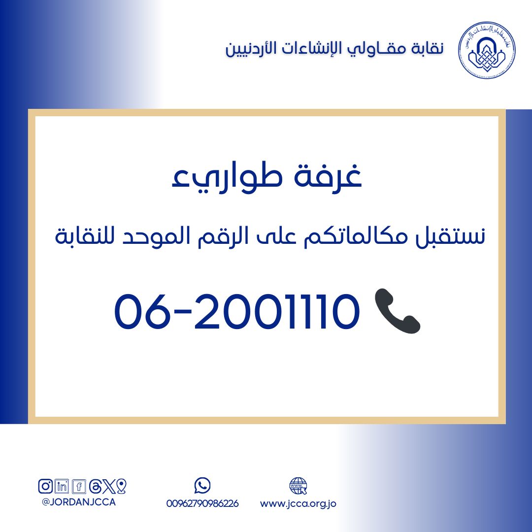 أعلنت نقابة مقاولي الإنشاءات الأردنيين عن تشكيل غرفة طوارئ مركزية في مقر النقابة في عمّان، إلى جانب تفعيل غرف طوارئ فرعية في جميع فروع النقابة في محافظات المملكة، وذلك في إطار الاستعدادات الوطنية لمواجهة الظروف الجوية وأمطار الخير المتوقعة.