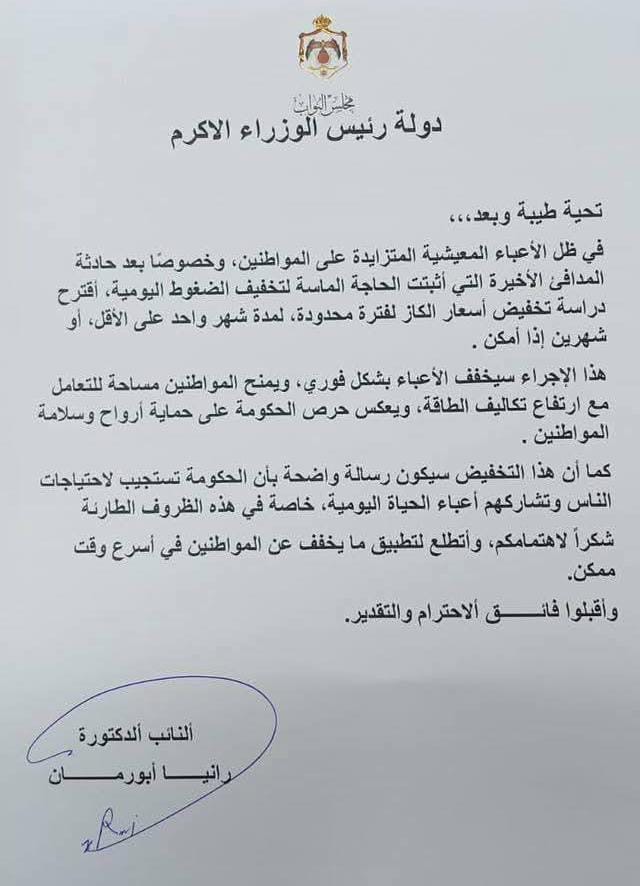 في استجابة وُصفت بالمهمة خلال ذروة فصل الشتاء، قررت الحكومة تخفيض سعر مادة الكاز، عقب مطالبات نيابية قادتها النائب الدكتورة رانيا أبو رمان، ركّزت فيها على الأعباء المعيشية المتزايدة التي تتحملها الأسر، لا سيما في ما يتعلق بتكاليف التدفئة.