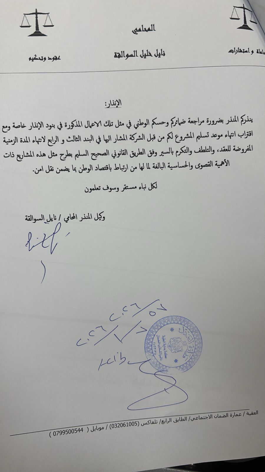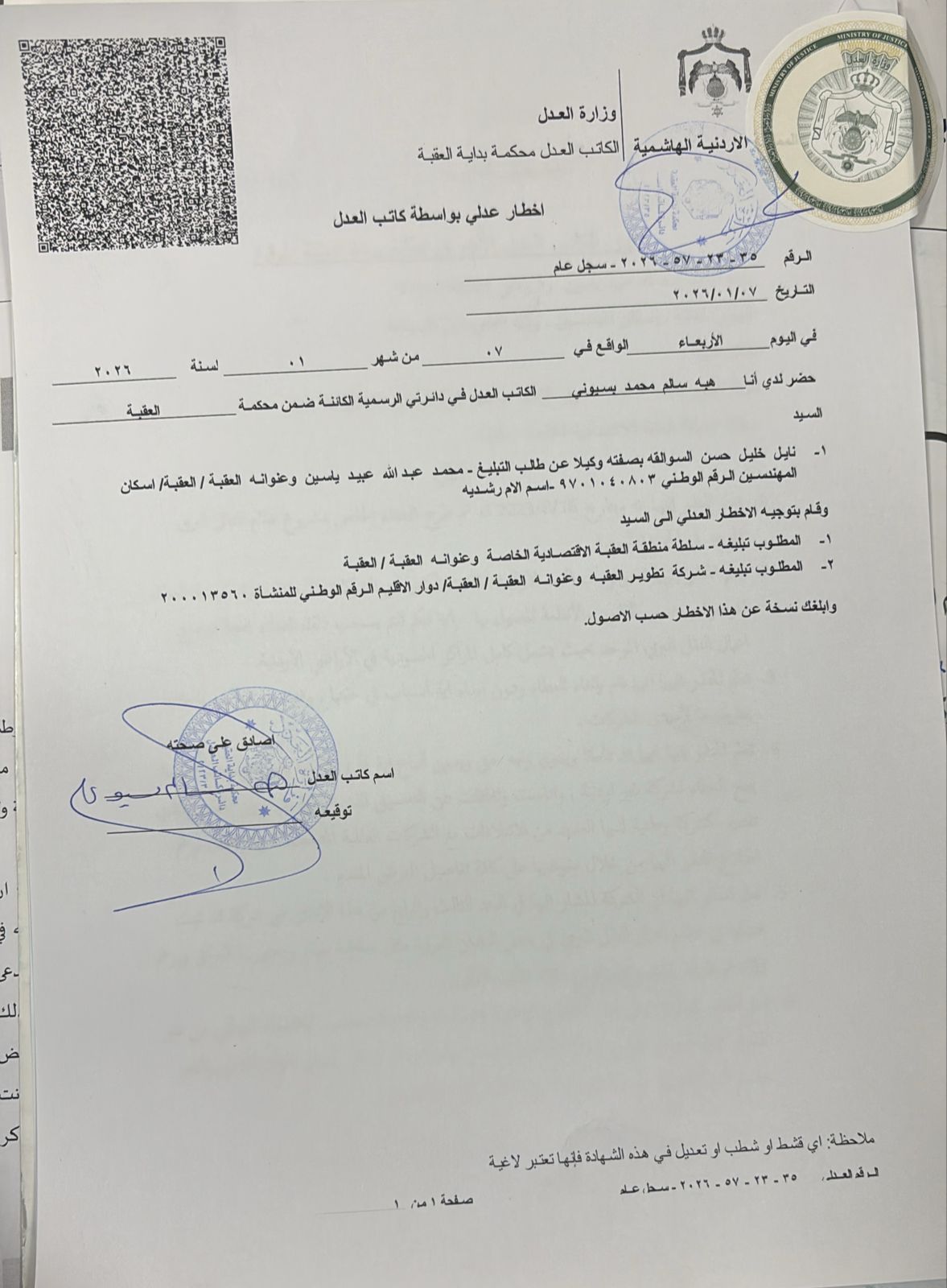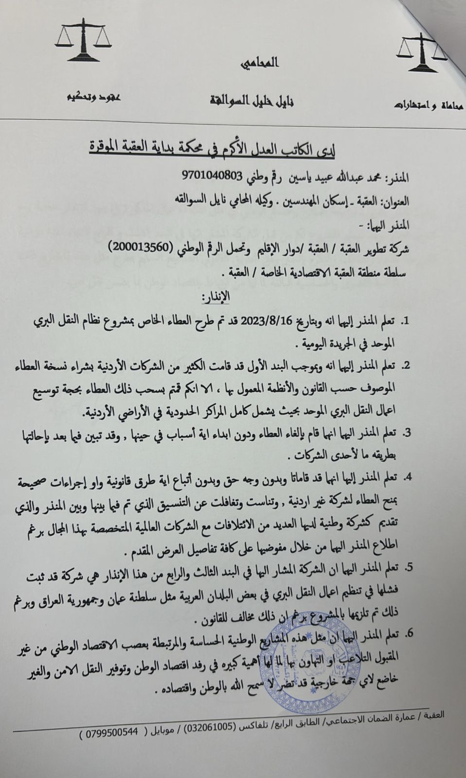 وطالب المستثمر شركة تطوير العقبة بإعادة النظر في إجراءات الإحالة، ووقف أي آثار قانونية أو تنفيذية مترتبة على العطاء إلى حين معالجة الاختلالات المشار إليها، محذرًا من اللجوء إلى القضاء والجهات الرقابية المختصة في حال عدم الاستجابة لمضمون الإنذار.