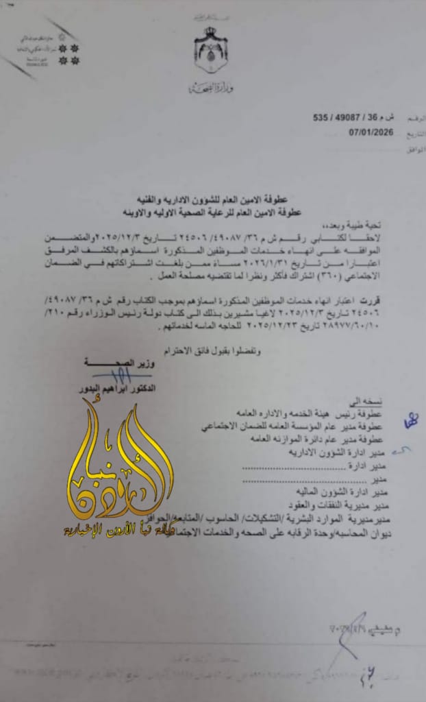 ألغى وزير الصحة، الدكتور ابراهيم البدور، اليوم الأربعاء، قراراً إدارياً بإنهاء خدمات 15 موظفاً في الوزارة.