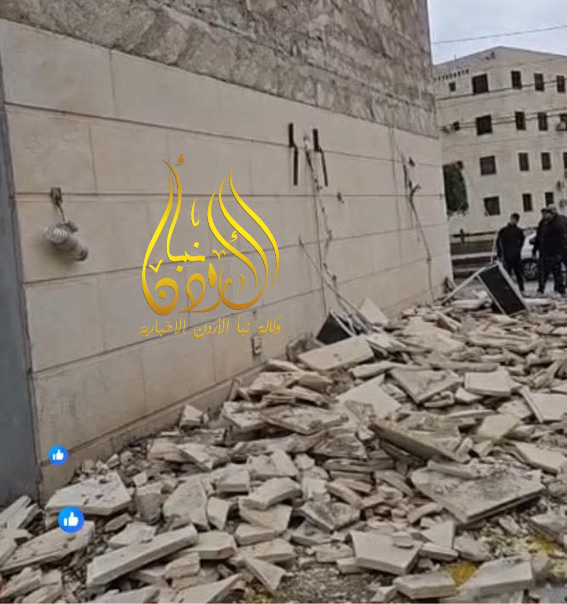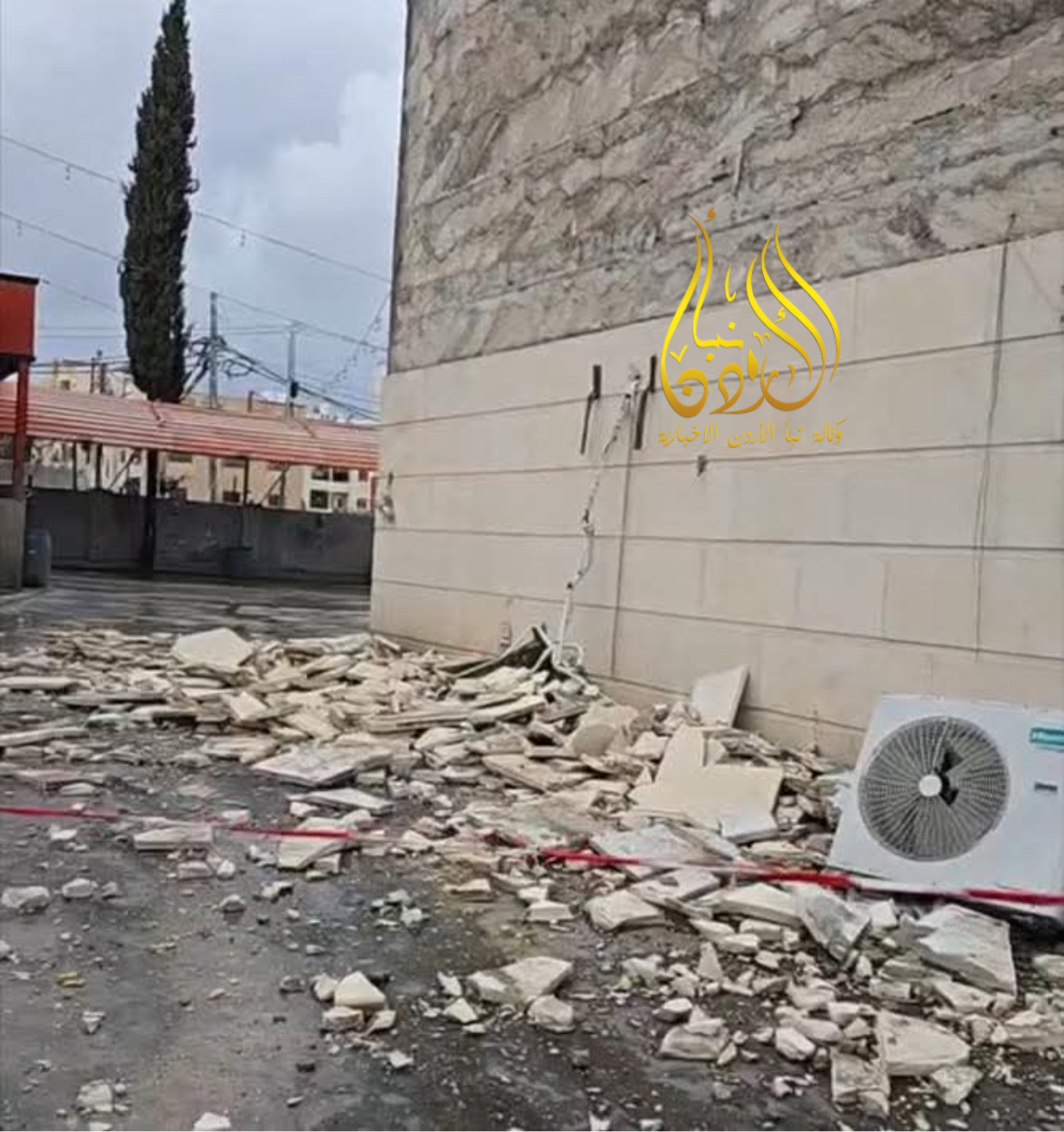 أدت الأحوال الجوية إلى سقوط الواجهة الحجرية لمبنى في إربد وذلك نتيجة سرعة الرياح.