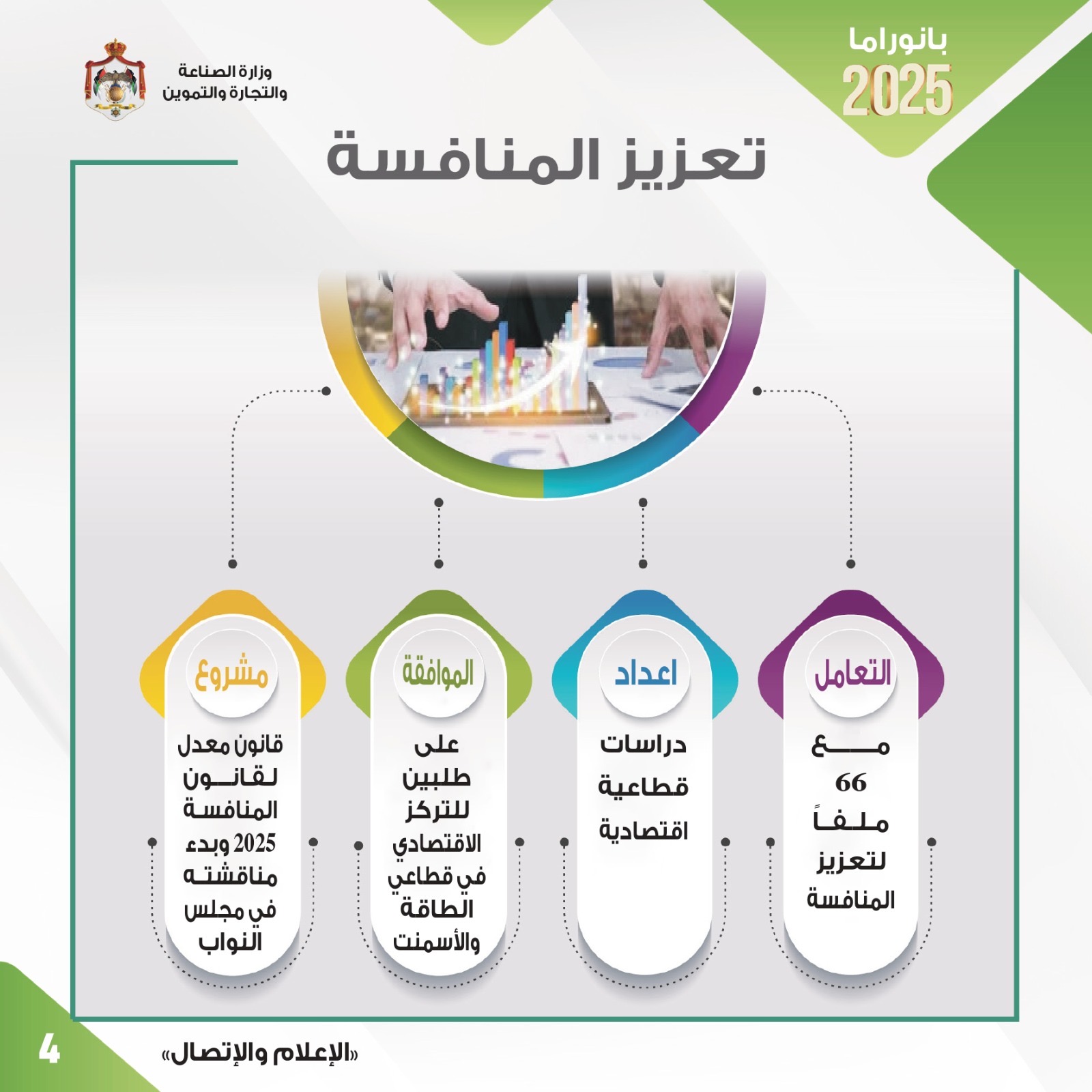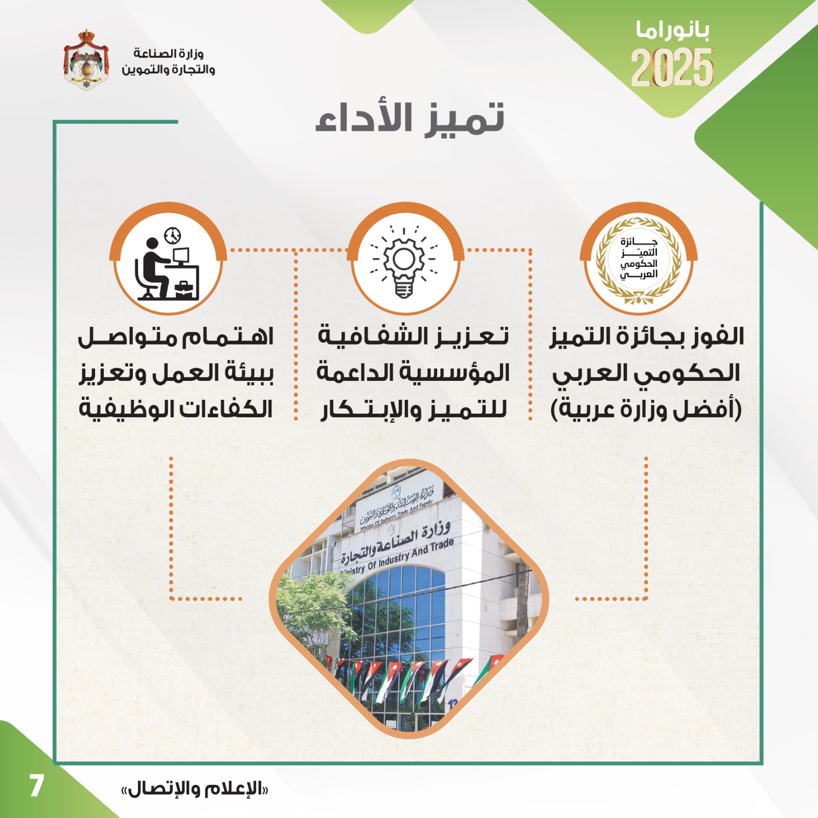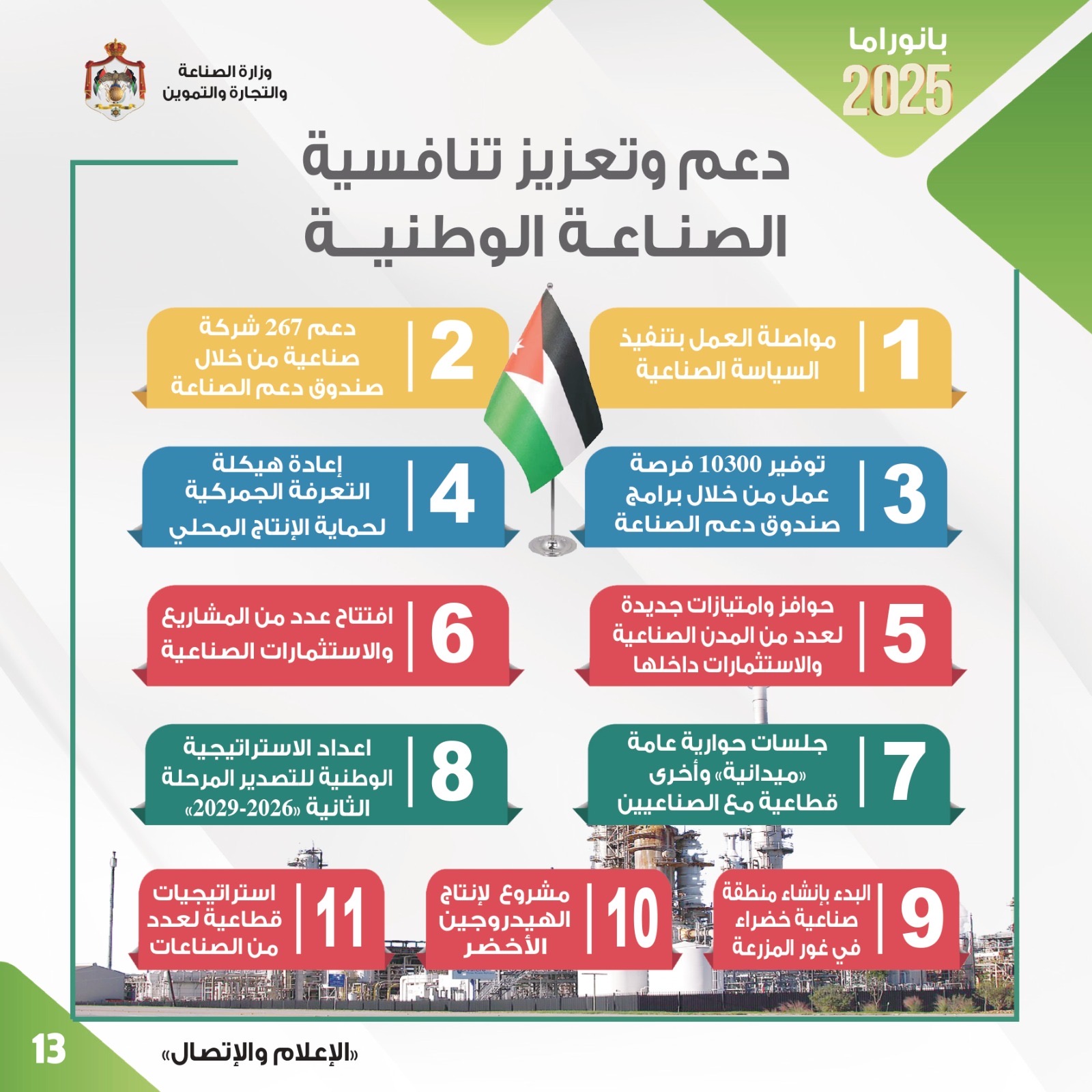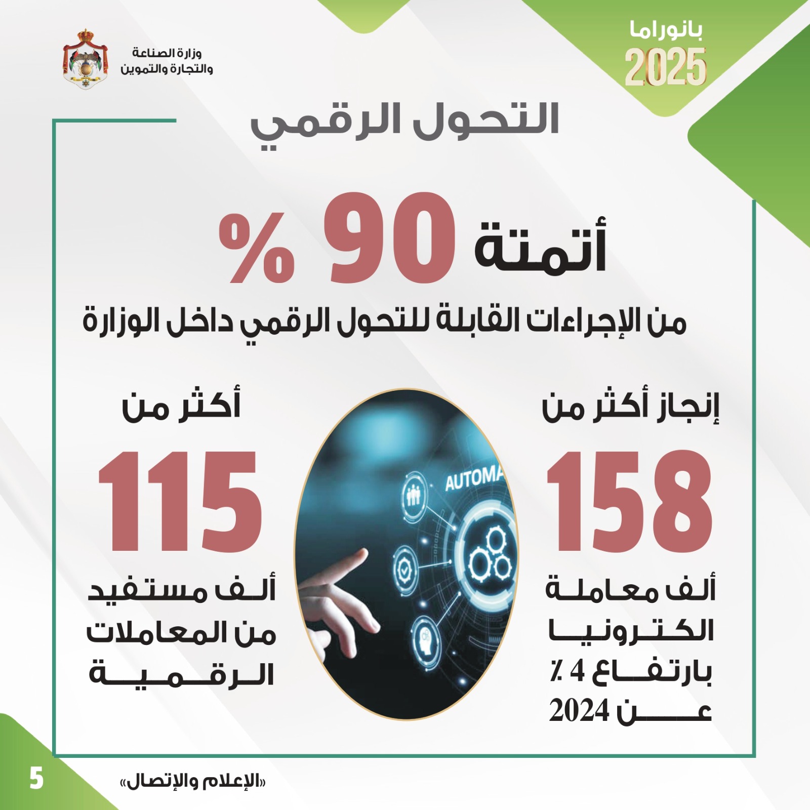 قال وزير الصناعة والتجارة والتموين المهندس يعرب القضاة أن الوزارة حققت العام الماضي العديد من الإنجازات النوعية في مختلف الملفات والمهام التي تضطلع بها وبما يتماشى مع مستهدفات رؤية التحديث الاقتصادي وبالشكل الذي يعزز الأداء الاقتصادي وزيادة النمو وتوفير فرص العمل وتبسيط وتسريع الإجراءات وأتمتتها.