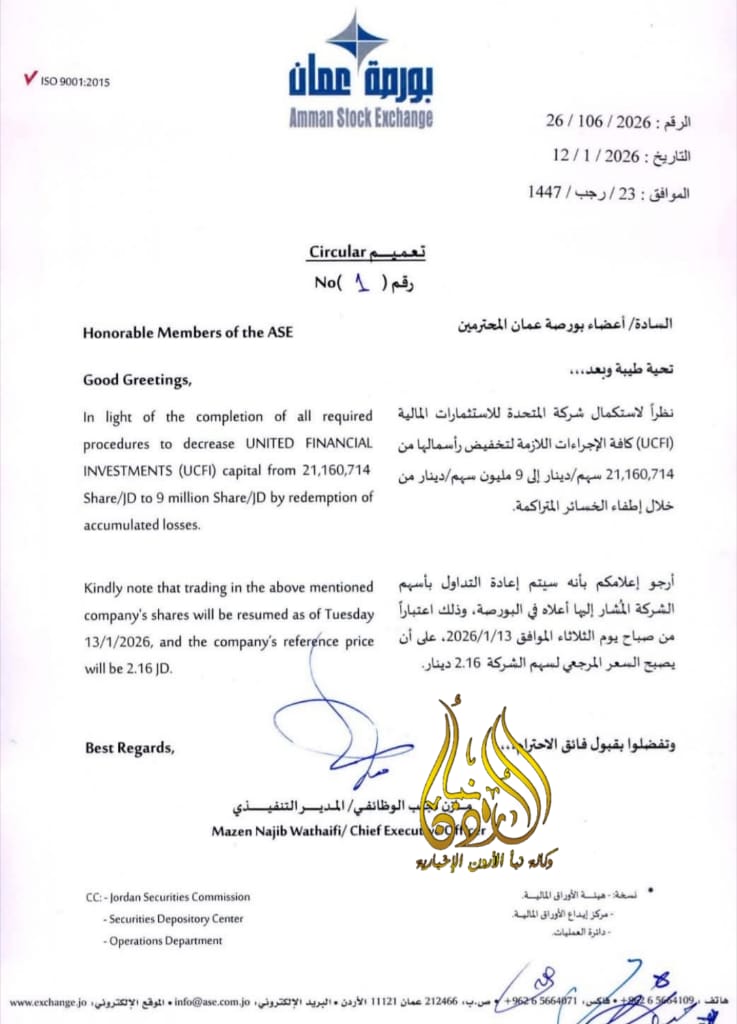 في تعميم حمل رقم (1)، قررت إدارة بورصة عمان، إعادة التداول بأسهم شركة المتحدة للاستثمارات المالية بعد تخفيض رأس المال إلى 9 مليون دينار.