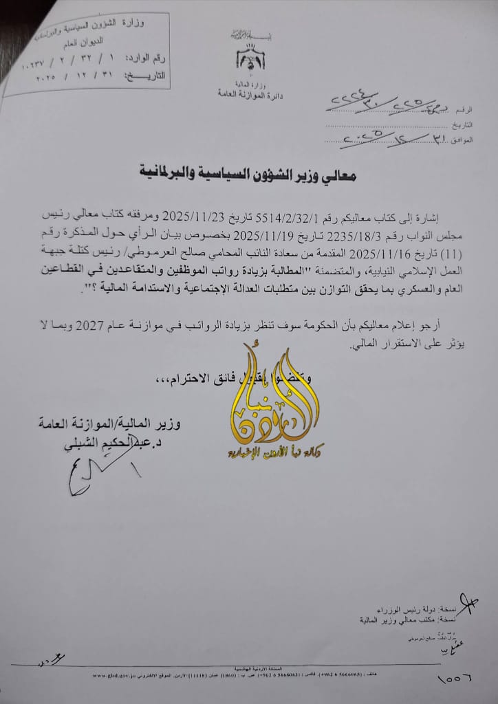 وجاء في جواب الوزير أن الحكومة ستنظر بزيادة الرواتب في موازنة عام 2027 وبما لا يؤثر على الاستقرار المالي .