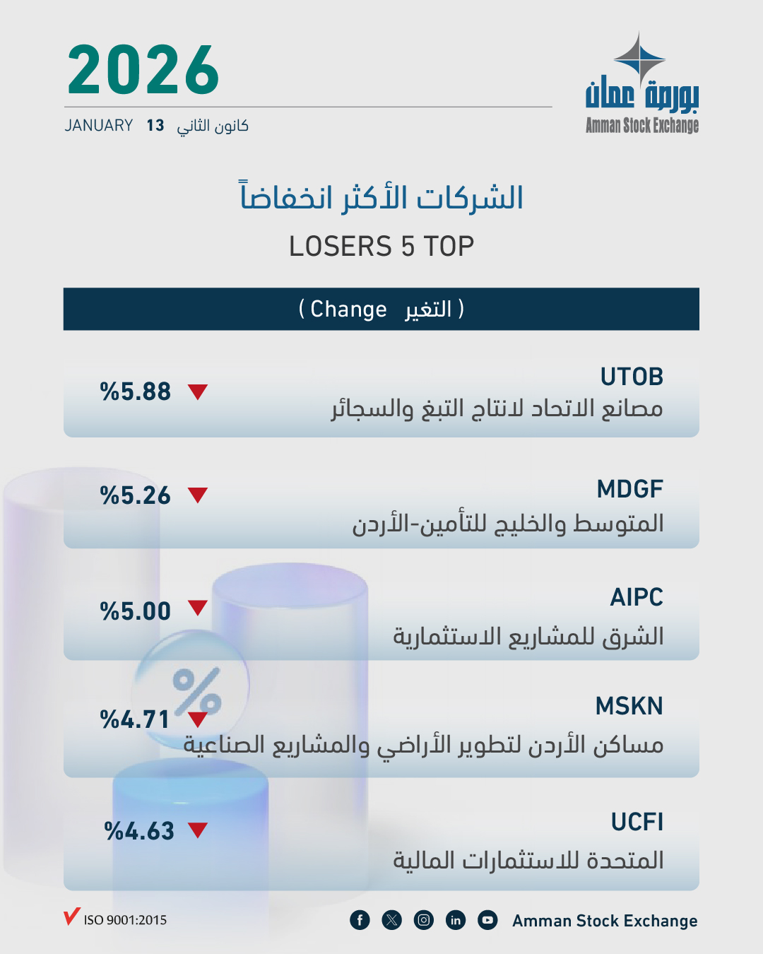 أما الشركات الخمس الأكثر انخفاضاً في أسعار أسهمها فهي مصانع الاتحاد لانتاج التبغ والسجائر بنسبة (5.88%), المتوسط والخليج للتأمين-الأردن بنسبة (5.26%), الشرق للمشاريع الاستثمارية بنسبة (5.00%), مساكن الأردن لتطوير الأراضي والمشاريع الصناعية بنسبة (4.71%), و المتحدة للاستثمارات المالية بنسبة (4.63%).