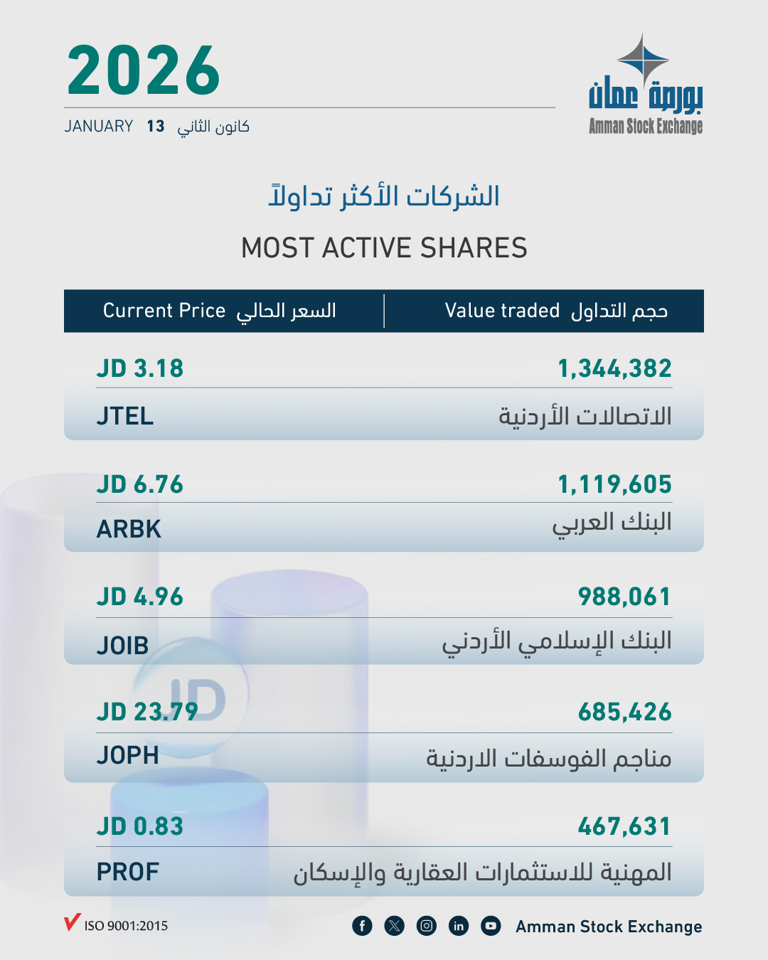 بلغ حجم التداول الإجمالي ليوم الثلاثاء 13/01/2026 حوالي (8.3) مليون دينار وعدد الأسهم المتداولة (4.1) مليون سهم، نفذت من خلال (3,382) عقداً.