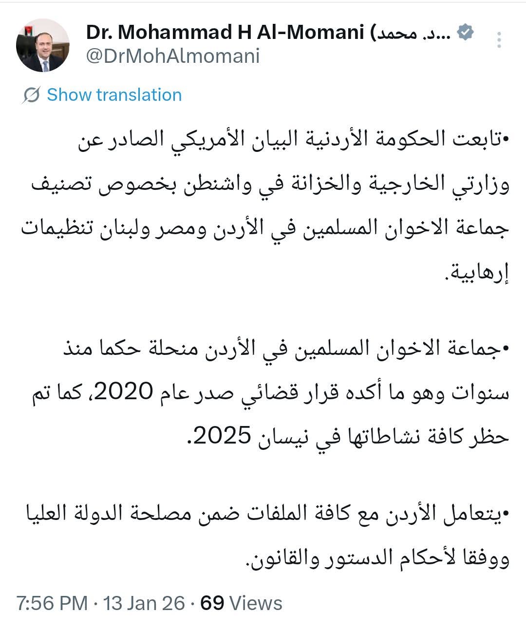 عاجل - الأردن : أول تعليق حكومي على القرار الأمريكي بتصنيف الإخوان المسلمين تنظيم إرهابي