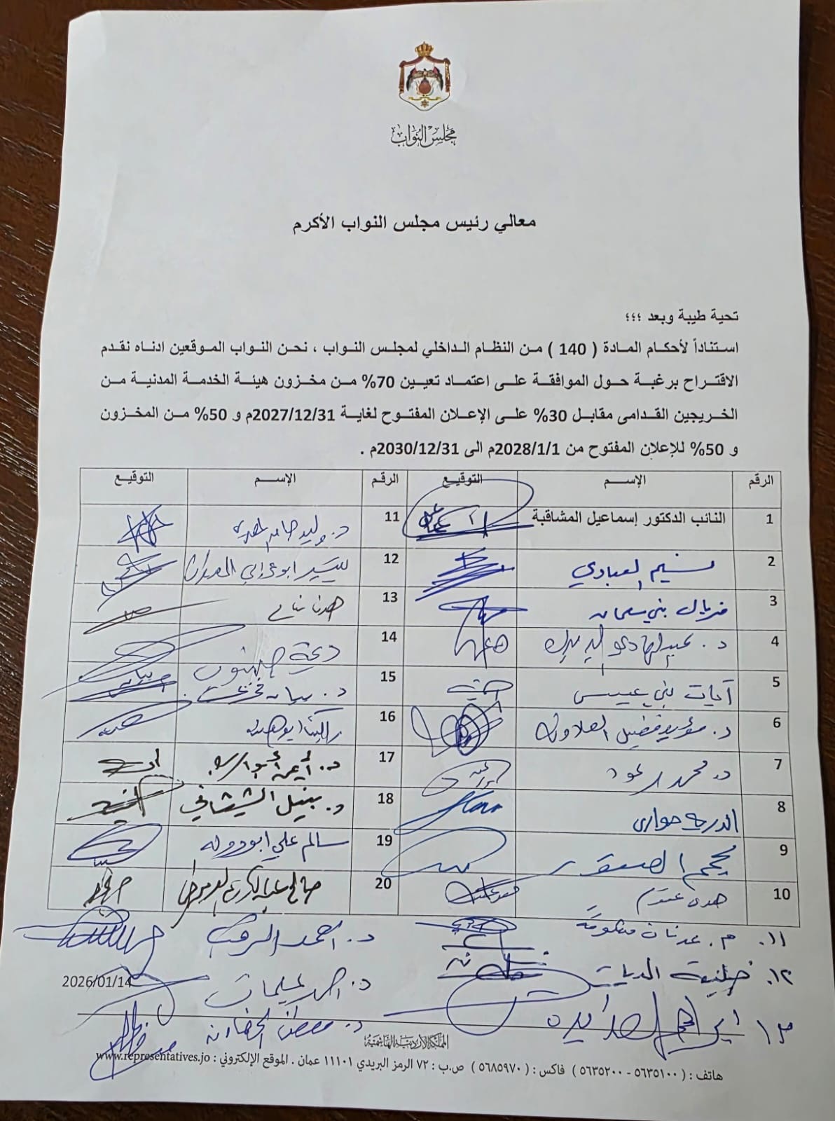 قدّم النائب إسماعيل المشاقبة مذكرة رسمية إلى معالي رئيس مجلس النواب، استنادًا لأحكام المادة (140) من النظام الداخلي للمجلس، طالبوا فيها بإعادة النظر بنسب التعيين من مخزون هيئة الخدمة المدنية، بما يحقق العدالة ويُنصف الخريجين المنتظرين على قوائم التوظيف.