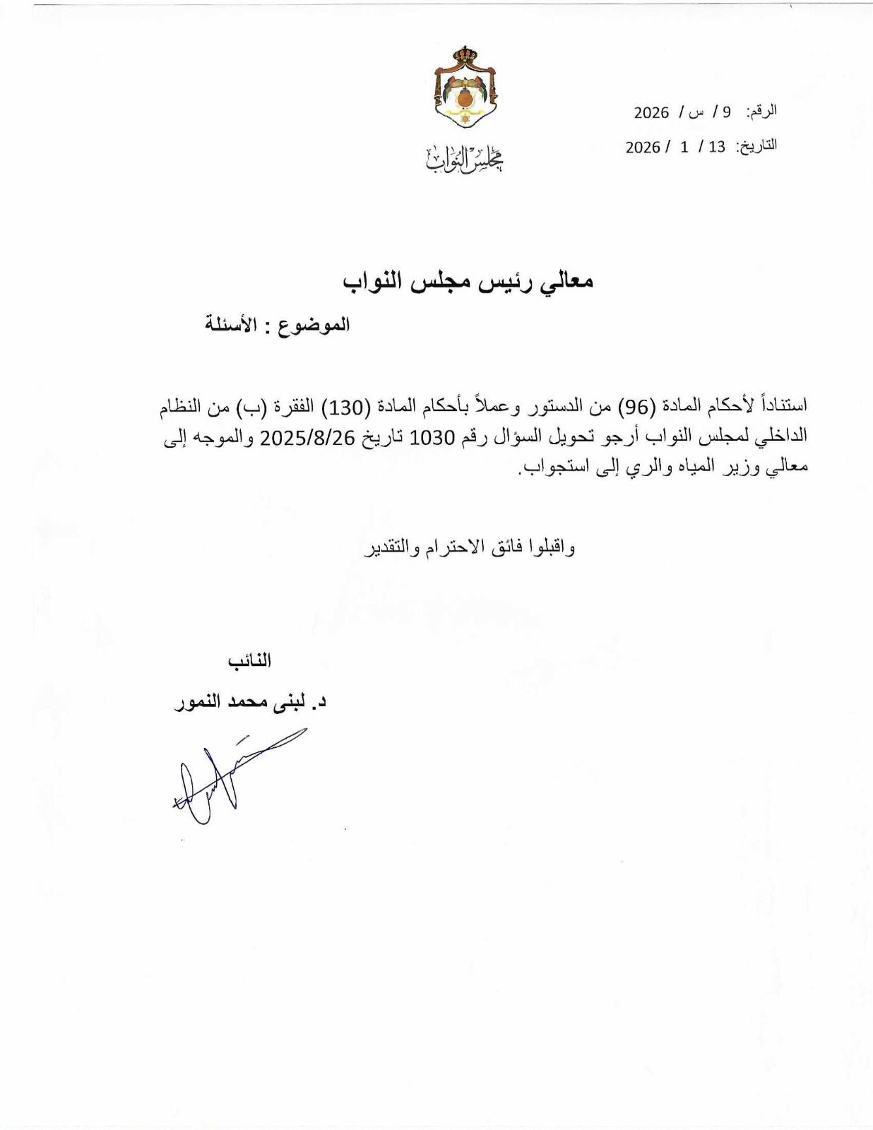 كما طالبت النمور بتوضيح حجم الفاقد المائي السنوي في العقبة، والإجراءات المتخذة لمعالجته، وآليات التعامل مع شكاوى المواطنين، إلى جانب الخطط المستقبلية لمواجهة التحديات الناتجة عن الزيادة السكانية والنمو السياحي والصناعي في المحافظة.