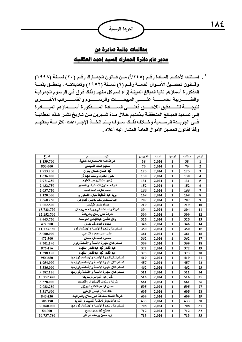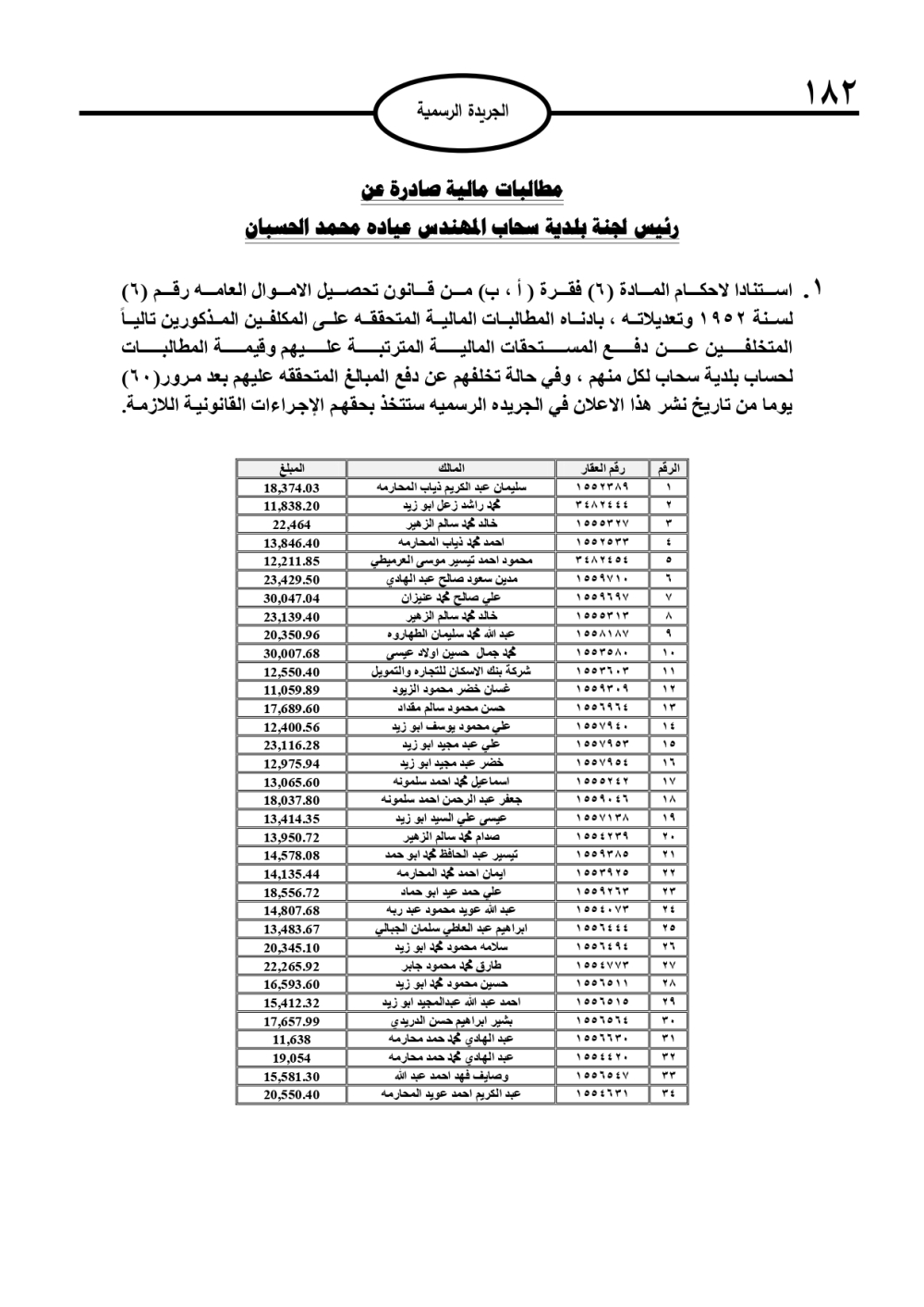نشرت الجريدة الرسمية، استنادًا إلى أحكام قانون تحصيل الأموال العامة، إعلانات تتضمن مطالبات مالية بحق آلاف الأردنيين، صادرة عن جهات حكومية متعددة.