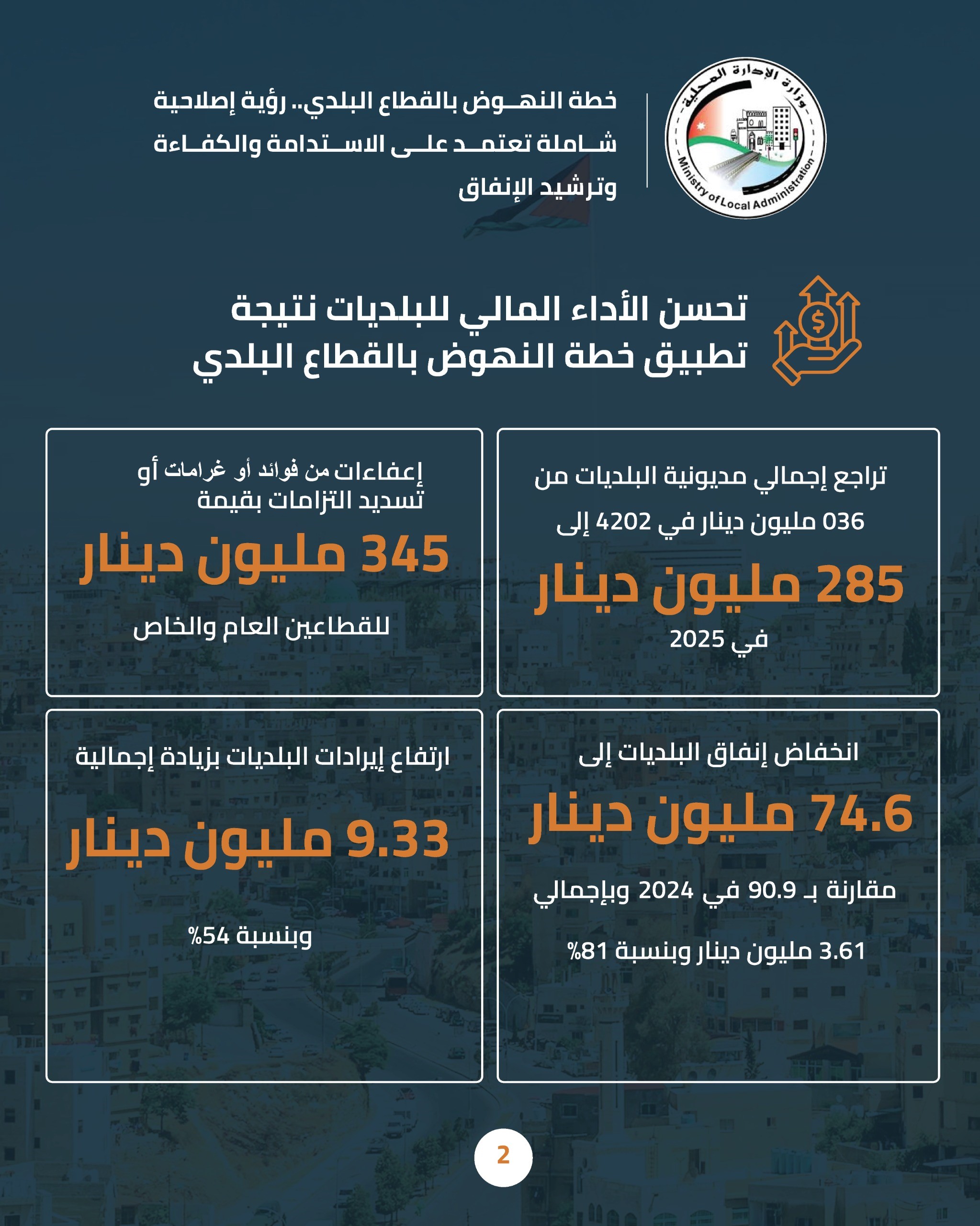 وبين أنه ضمن خطة الاصلاح المالي، حرصت الخطة على ضمان تدفق نقدي سنوي لبنك تنمية المدن والقرى، وإطلاق سياسة ائتمانية منضبطة تراعي واقع البلديات وأولويات المشاريع، حيث بلغت التدفقات النقدية 35 مليون دينار في السنة الأولى، وبقيمة تراكمية قدرها 175 مليون دينار خلال خمس سنوات.