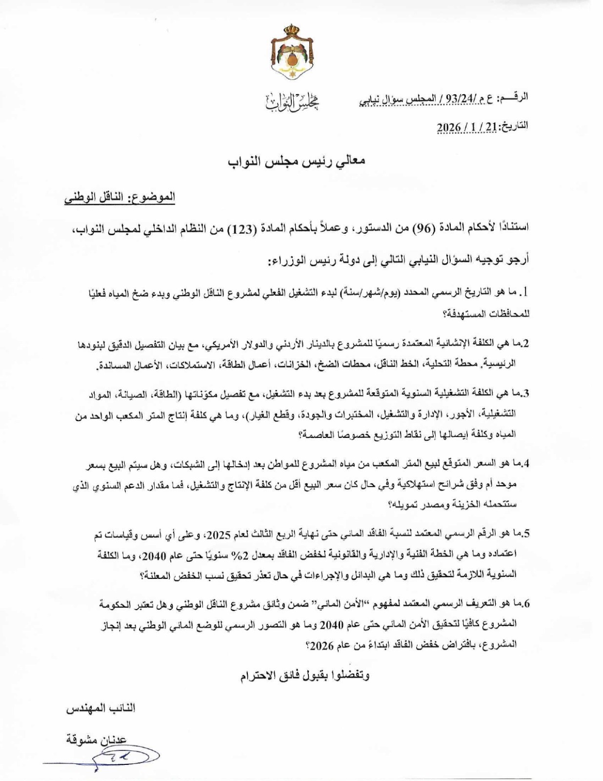 6.ما هو التعريف الرسمي المعتمد لمفهوم "الأمن المائي” ضمن وثائق مشروع الناقل الوطني وهل تعتبر الحكومة المشروع كافيًا لتحقيق الأمن المائي حتى عام 2040 وما هو التصور الرسمي للوضع المائي الوطني بعد إنجاز المشروع، بافتراض خفض الفاقد ابتداءً من عام 2026؟