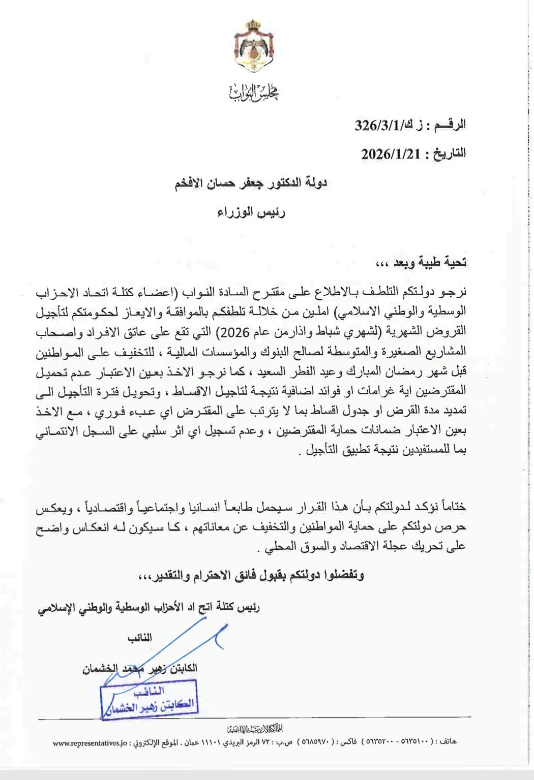 احمد قدورة - وجّه رئيس كتلة اتحاد الأحزاب الوسطية والوطني الإسلامي النيابية، النائب زهير الخشمان، مذكرة نيابية إلى دولة رئيس الوزراء الدكتور جعفر حسان، طالب فيها الحكومة بتأجيل الأقساط الشهرية المترتبة على الأفراد وأصحاب المشاريع الصغيرة والمتوسطة لصالح البنوك والمؤسسات المالية، خلال شهري شباط وآذار من عام 2026.