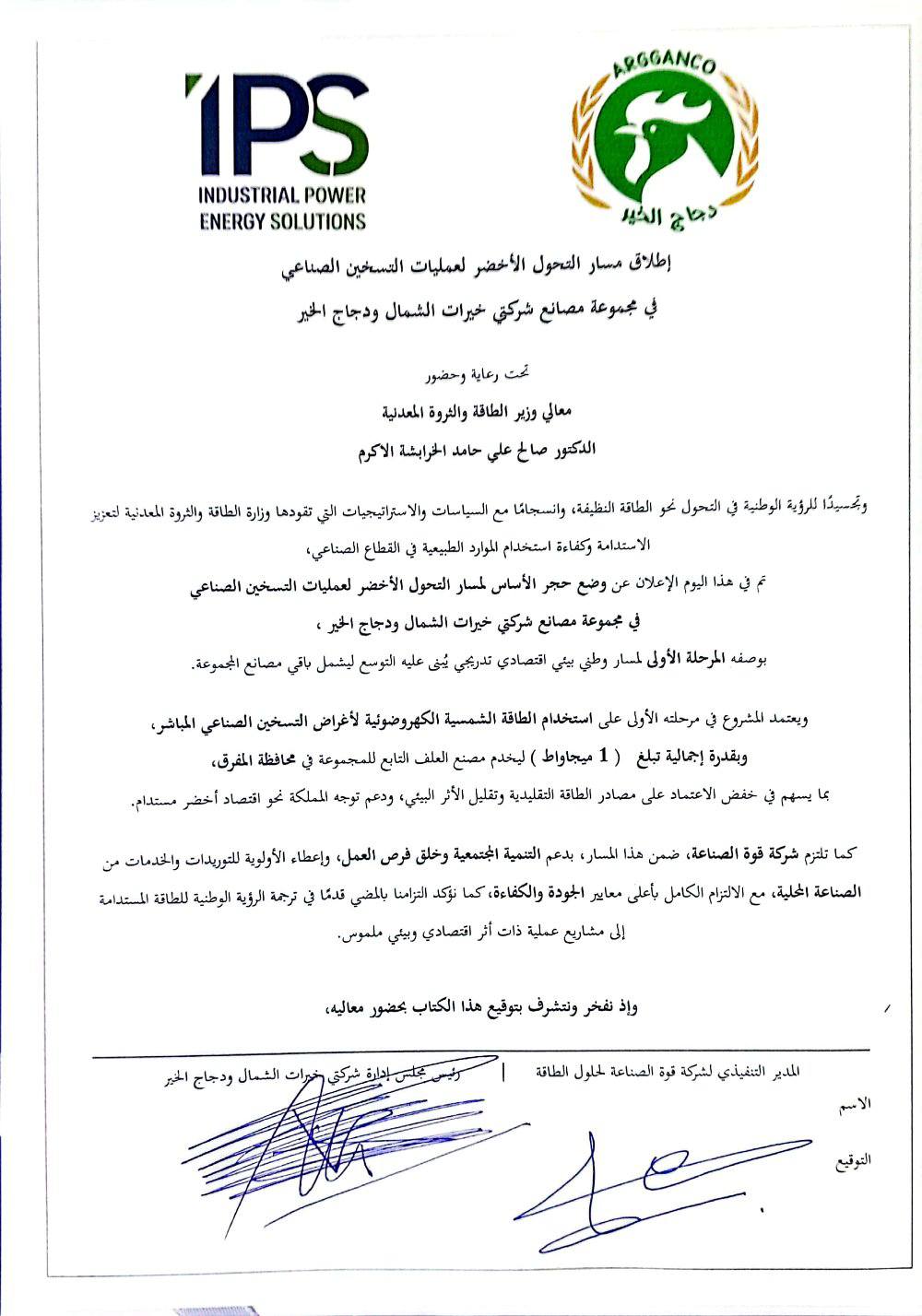 أعلن الدكتور خيرو ارشيد العرقان المشاقبة، رئيس مجلس إدارتي شركتي خيرات الشمال ودجاج الخير، عن إطلاق شراكة بين شركة قوة الصناعة لحلول الطاقة، وشركتي خيرات الشمال ودجاج الخير، وذلك تحت رعاية وزير الطاقة والثروة المعدنية الدكتور صالح الخرابشة.