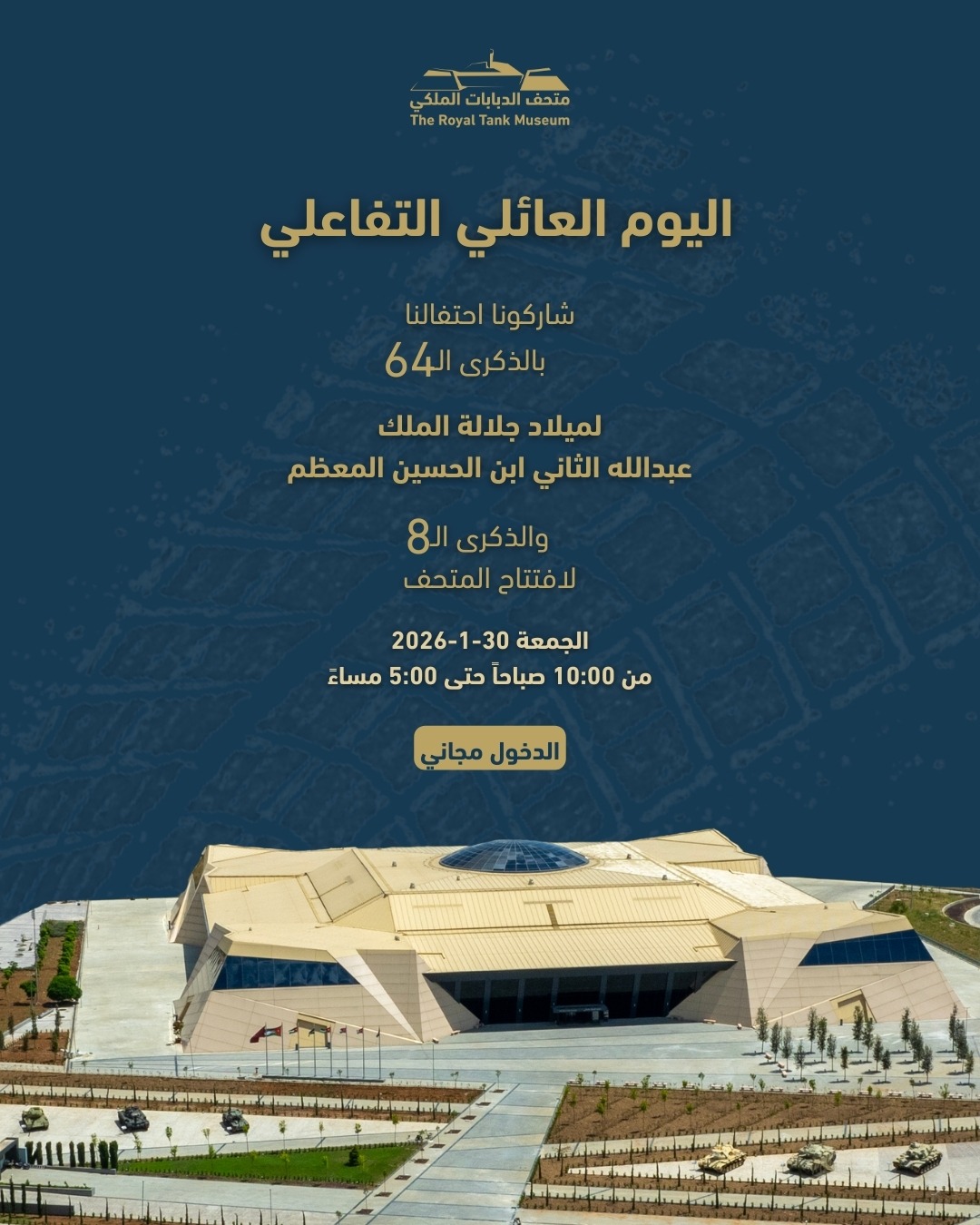 أعلن متحف الدبابات الملكي عن تنظيم احتفال بمناسبة عيد ميلاد جلالة الملك عبدالله الثاني الرابع والستين، والذكرى الثامنة لافتتاح المتحف وذلك يوم الجمعة المقبل في مبنى المتحف.