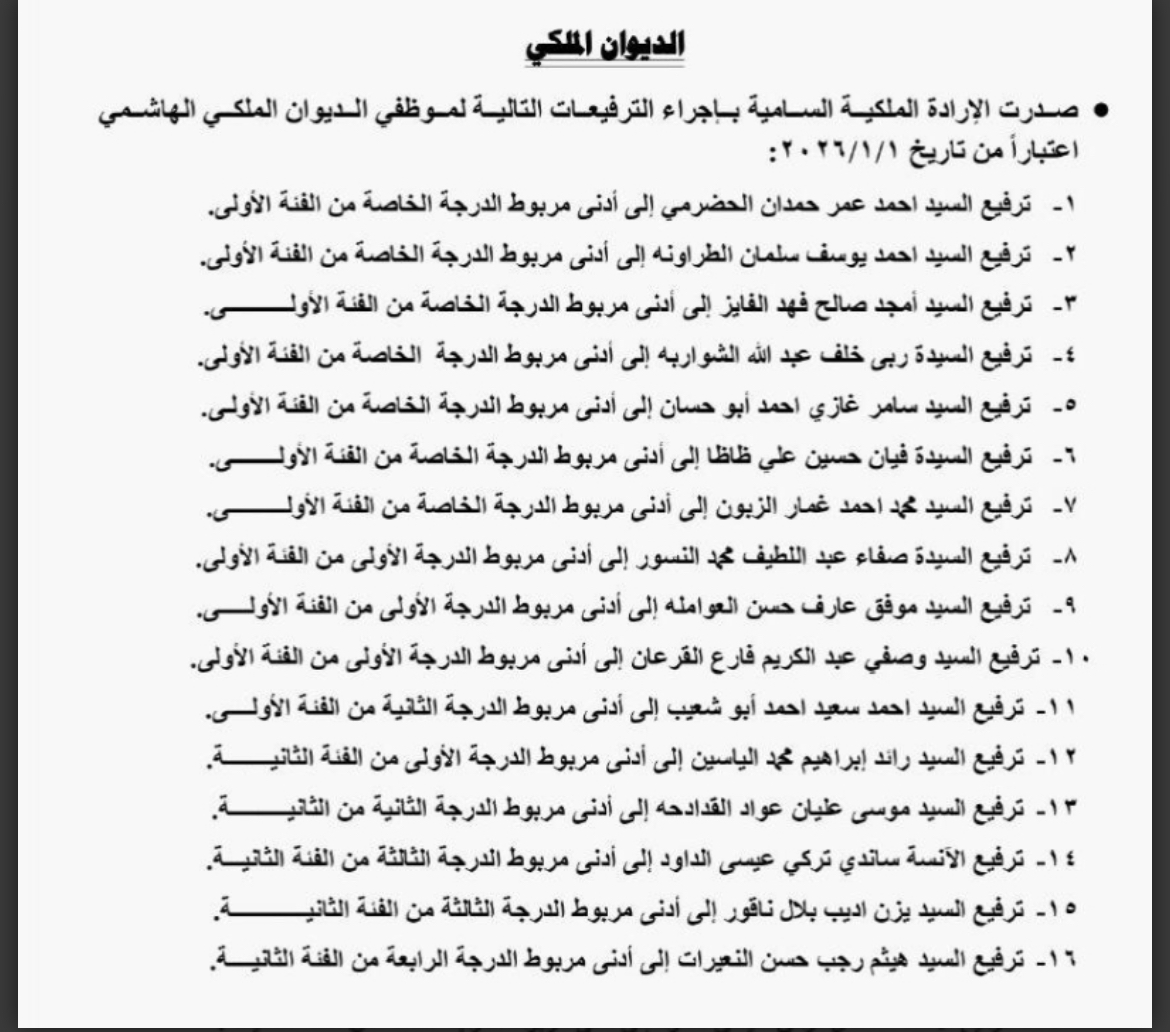 صدر في عدد الجريدة الرسمية اليوم الخميس، الإرادة الملكية السامية بترفيع 16 موظفا من موظفي الديوان الملكي الهاشمي، اعتبارا من 1-1-2026.