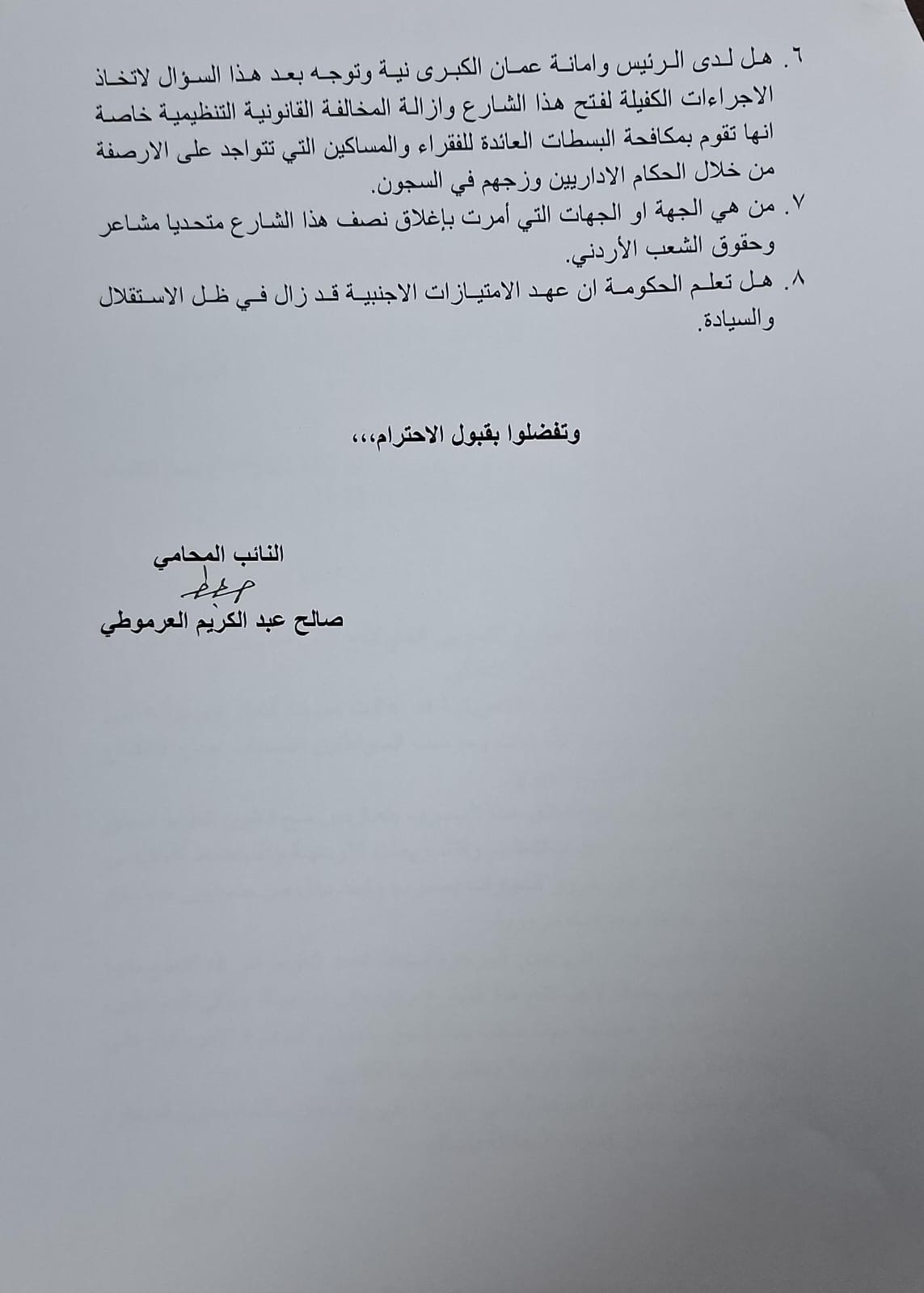 وختم النائب سؤاله بالاستفسار عن الجهة أو الجهات التي أصدرت قرار إغلاق نصف الشارع، مؤكداً أن عهد الامتيازات الأجنبية قد انتهى في ظل الاستقلال والسيادة الأردنية.