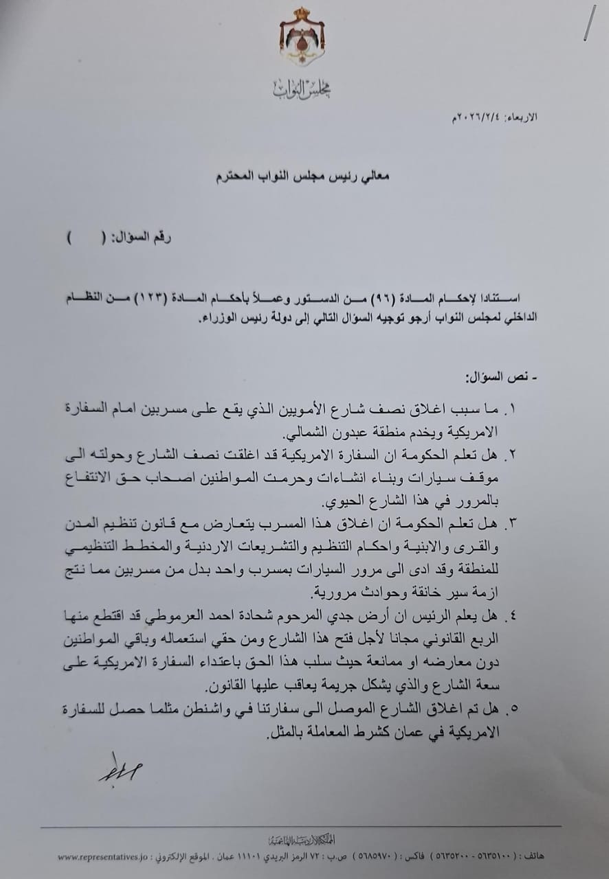 وجّه النائب المحامي صالح عبد الكريم العرموطي، الأربعاء الموافق 4/2/2026، سؤالاً نيابياً إلى دولة رئيس الوزراء، استناداً لأحكام المادة (96) من الدستور وعملاً بالمادة (123) من النظام الداخلي لمجلس النواب، حول إغلاق نصف شارع الأمويين أمام السفارة الأمريكية في منطقة عبدون الشمالي.