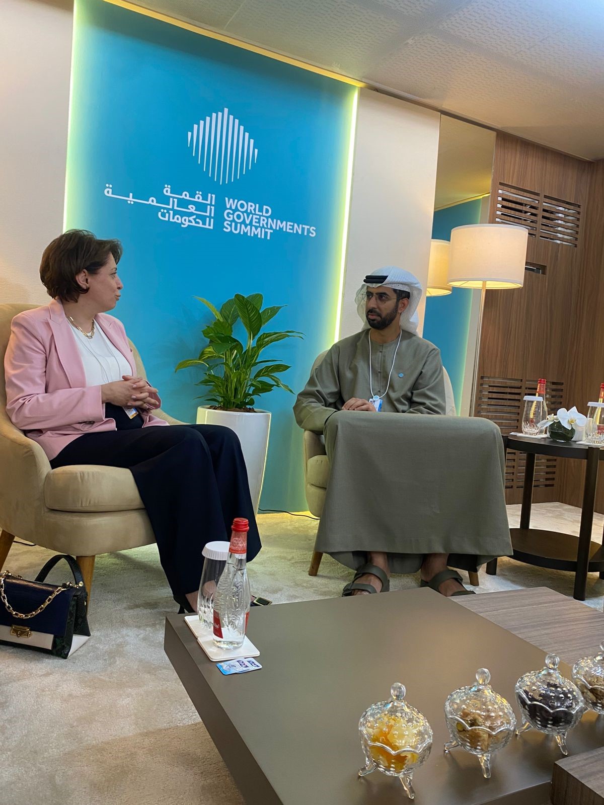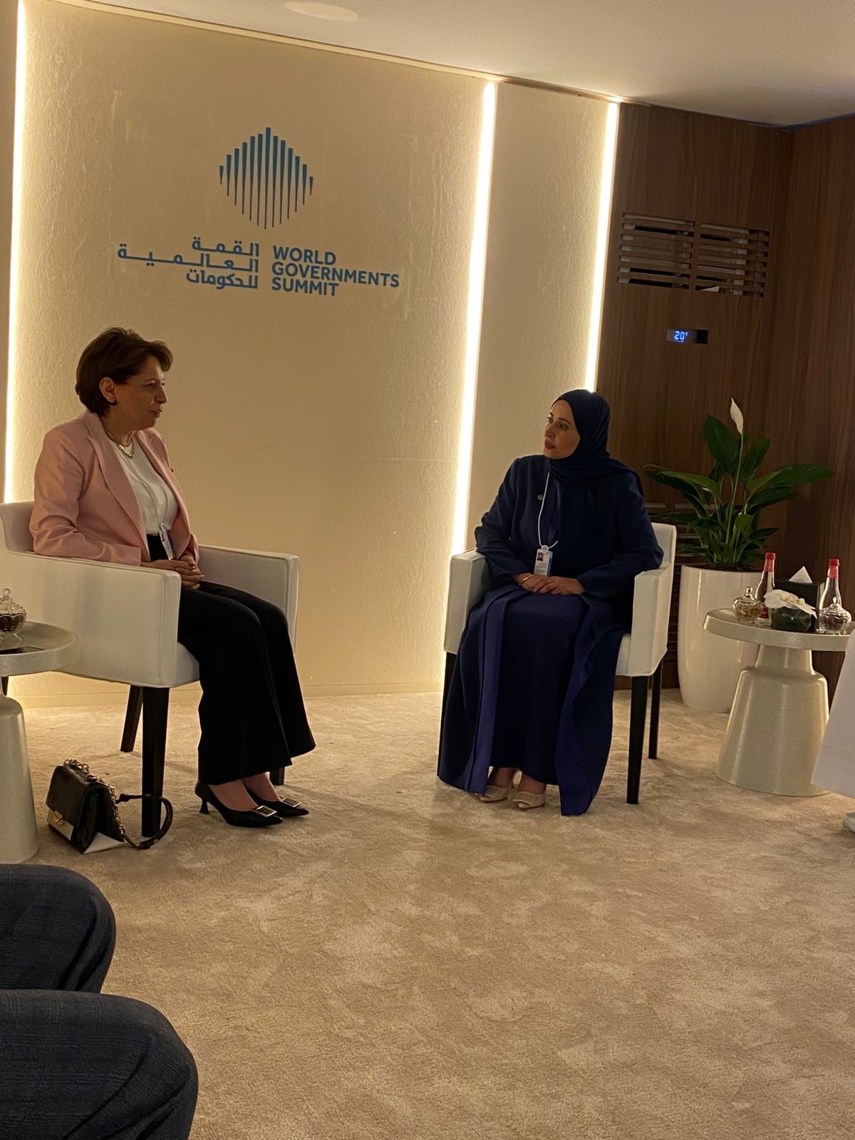 إلى ذلك، التقت البلبيسي مع وزيرة دولة للتطوير الحكومي والمستقبل الإماراتية عهود بنت خلفان الرومي، ووزير دولة للذكاء الاصطناعي والاقتصاد الرقمي وتطبيقات العمل عن بعد، الإماراتي عمر العلماء، وذلك على هامش مشاركتها في منتدى الإدارة الحكومية العربية ضمن القمة العالمية للحكومات.